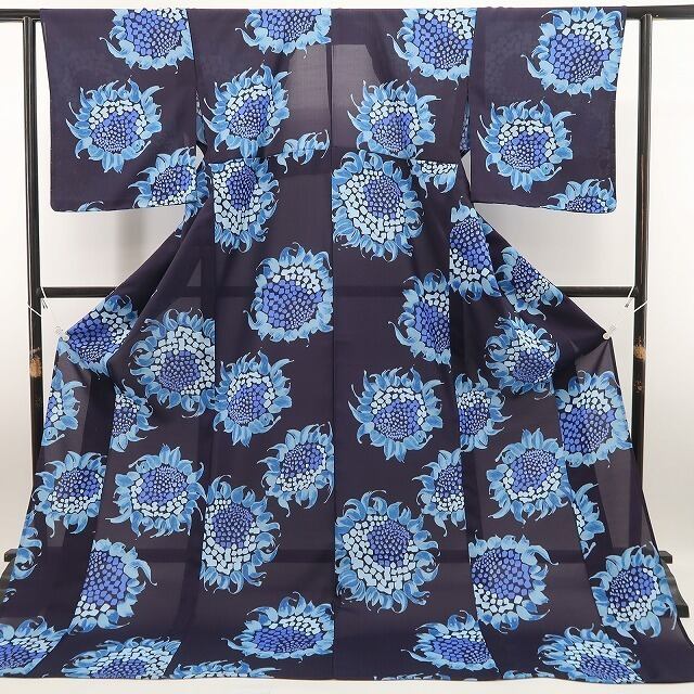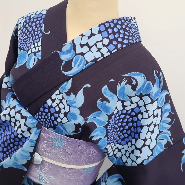 鉄紺色の色地に爽やかな色味で生き生きとした表情を魅せる夏ヒマワリの花、それは納涼に描き込まれた華を届ける夏風情、シンプルなれども視覚をとらえる色挿しの技は必見!それは“本加賀友禅ならではの飾り過ぎない美しさ”、正に高級浴衣の王道を行くひと品…サラリとしたクールドライ素材がより快適な着心地をお届けします。