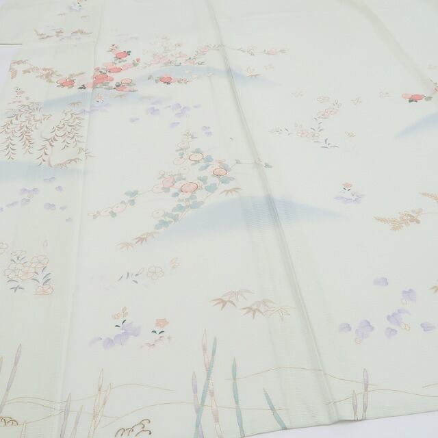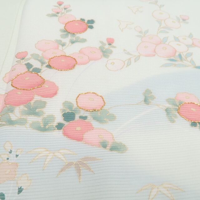 昨今、夏に和装をされる方が少なくなり希少なものとなりつつある絽のお着物は、二本の経糸を捩りながら緯糸を織り込んだもじり織で、盛夏のお召し物として涼しげでさらりとした生地質が魅力、着る方にもまた見る方にも清らかな風を感じるような涼しさを届けてくれます。