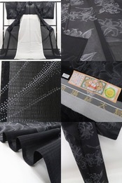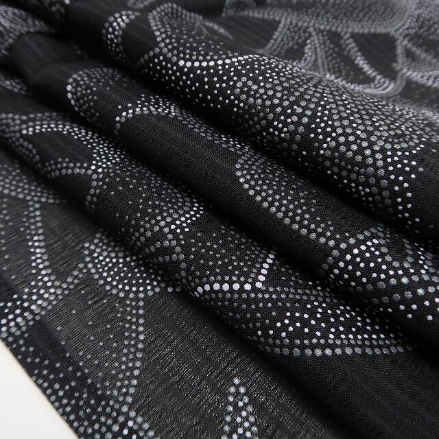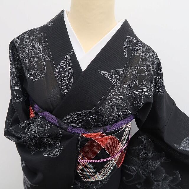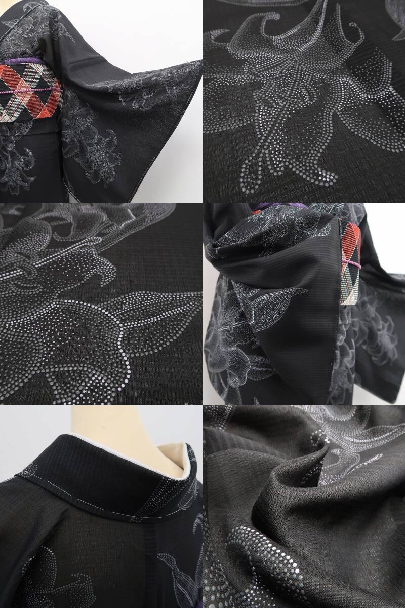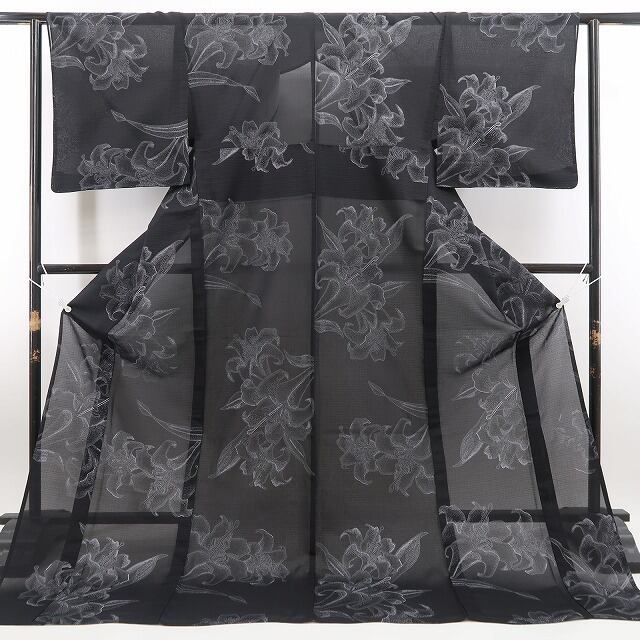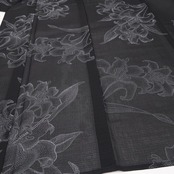 こちらの一枚は、黒の紗紬に印伝であしらわれた百合が咲く、唯一無二のデザイン。