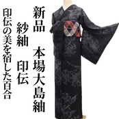 新品 紗紬 印伝 百合 お仕立て上がり品 夏着物 証紙付 仕付け糸付”印伝の美を宿した百合”本場大島紬 6404