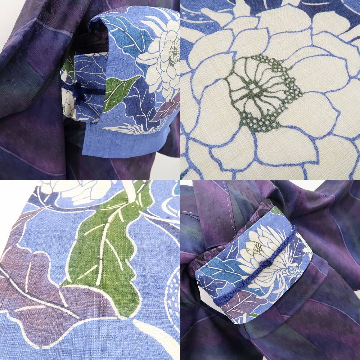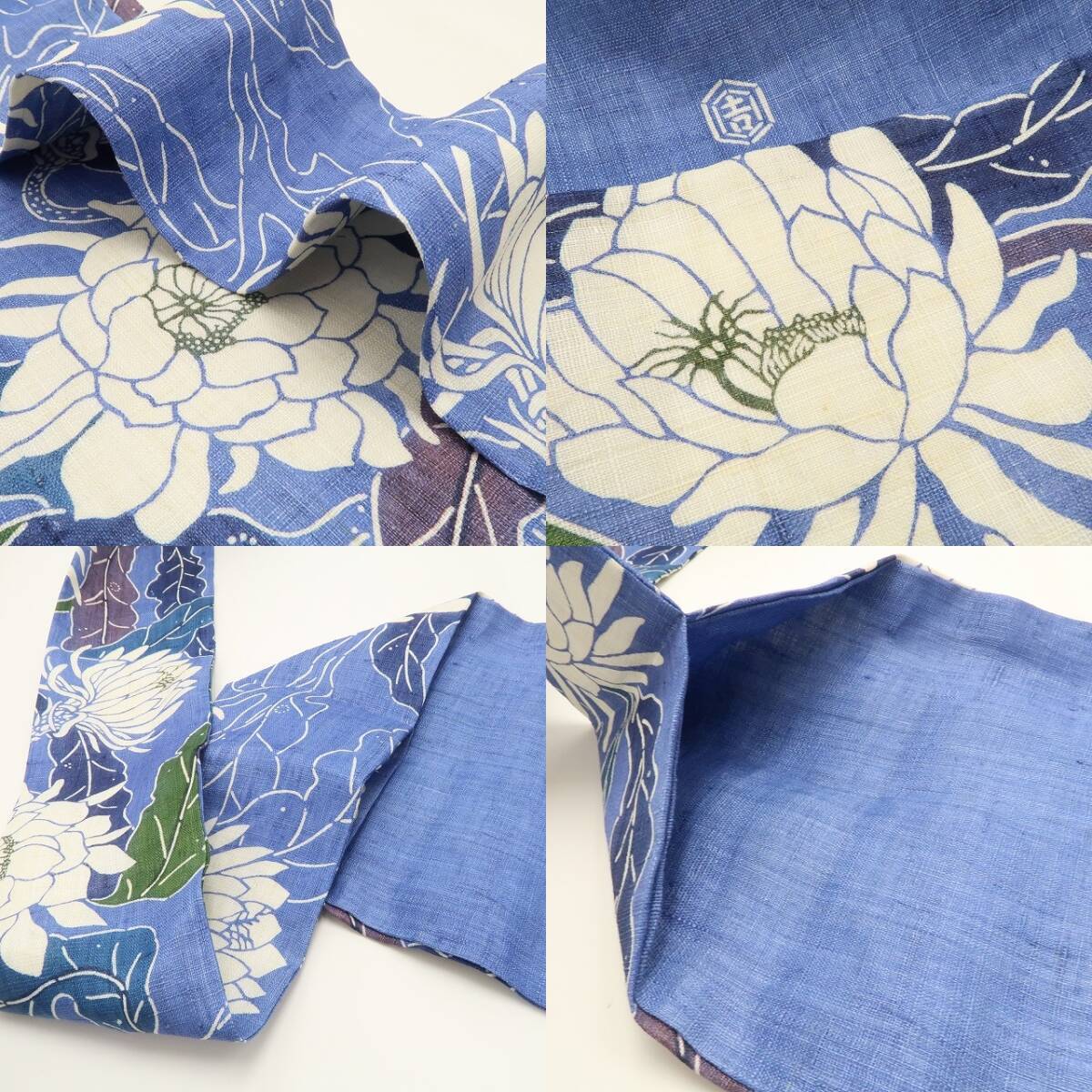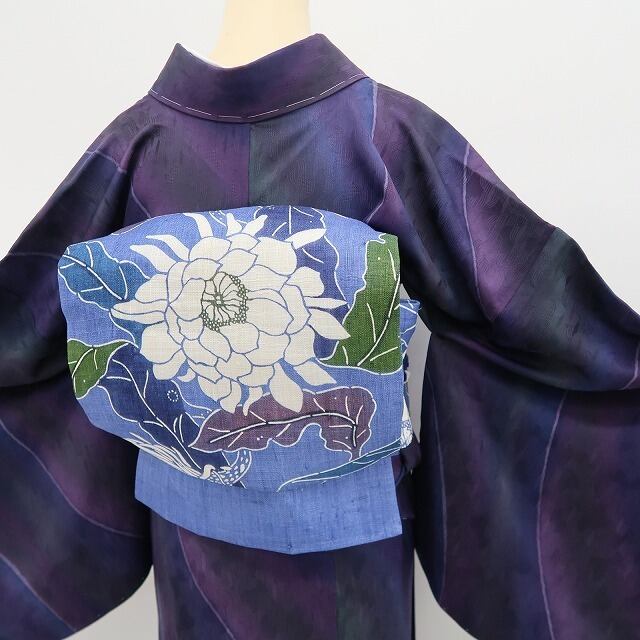杜若色の帯地に生き生きとした表情で描き込まれた“月下美人”の花、本麻素材のさらっとした質感に醸し出されるこの上ないお洒落感、それは夏帯の清々しさに巧みな意匠が照らし出す“今をときめく和の色艶”、ダイレクトに装いの楽しさを教えてくれるひと品、これぞ!栗山帯の神髄!見事です。