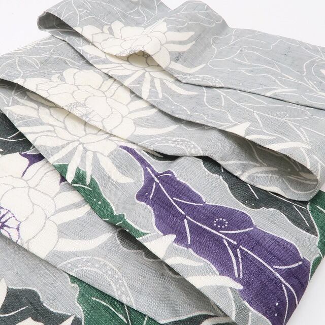 落ち着いたグレーの帯地に生き生きとした表情で描き込まれた“月下美人”の花、本麻素材のさらっとした質感に醸し出されるこの上ないお洒落感、それは夏帯の清々しさに巧みな意匠が照らし出す“今をときめく和の色艶”、ダイレクトに装いの楽しさを教えてくれるひと品、これぞ!栗山帯の神髄!見事です。