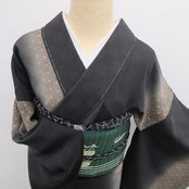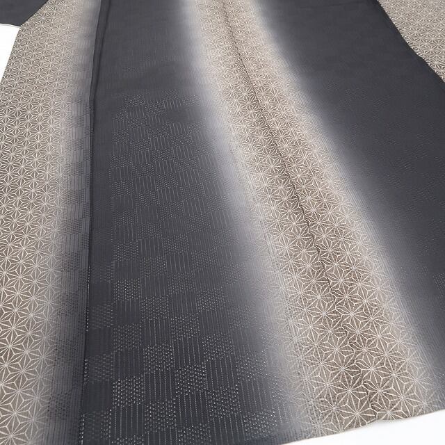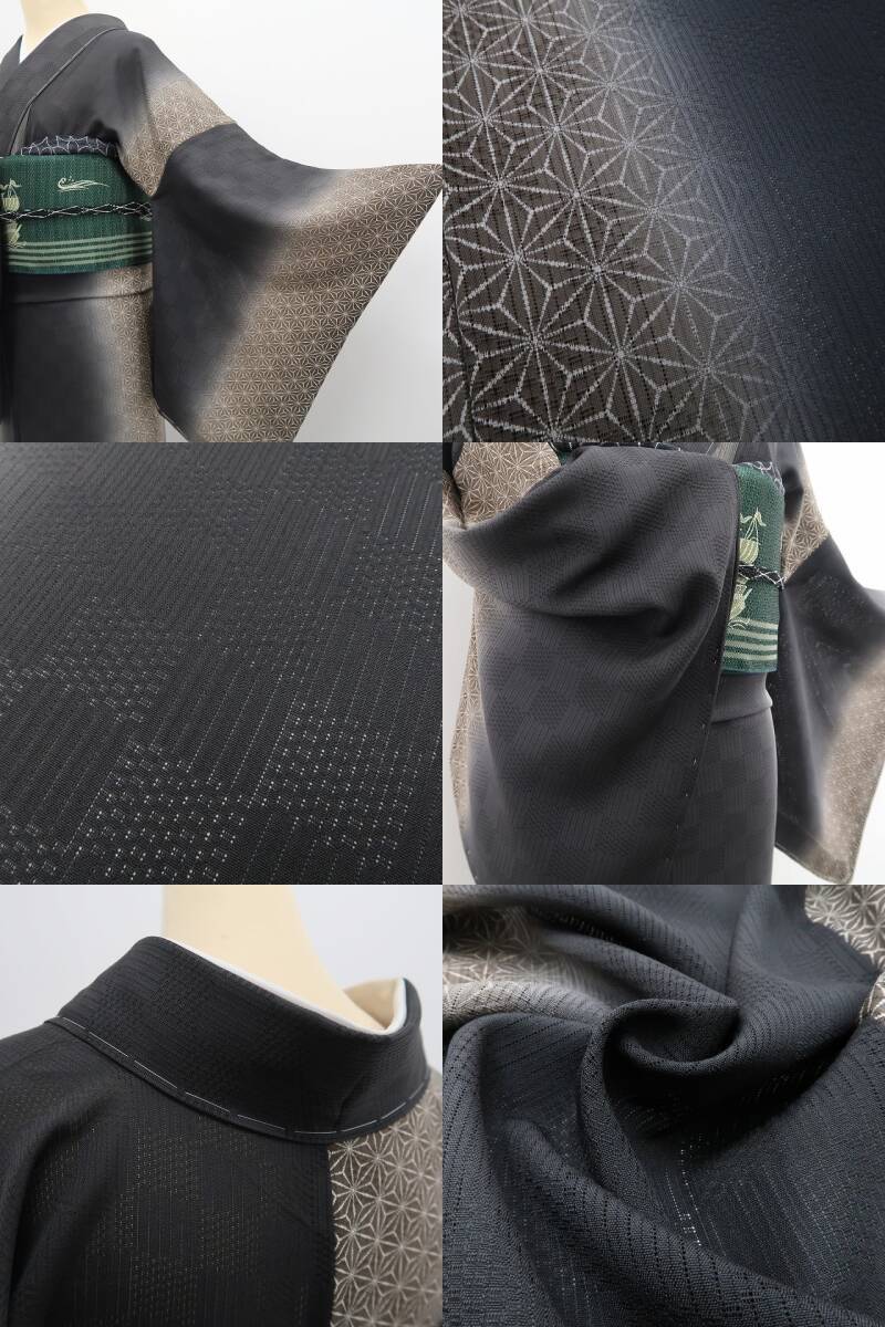 媚茶色の部分には麻の葉文様、黒地には変わり絽で市松模様を配した、贅沢なデザイン。