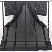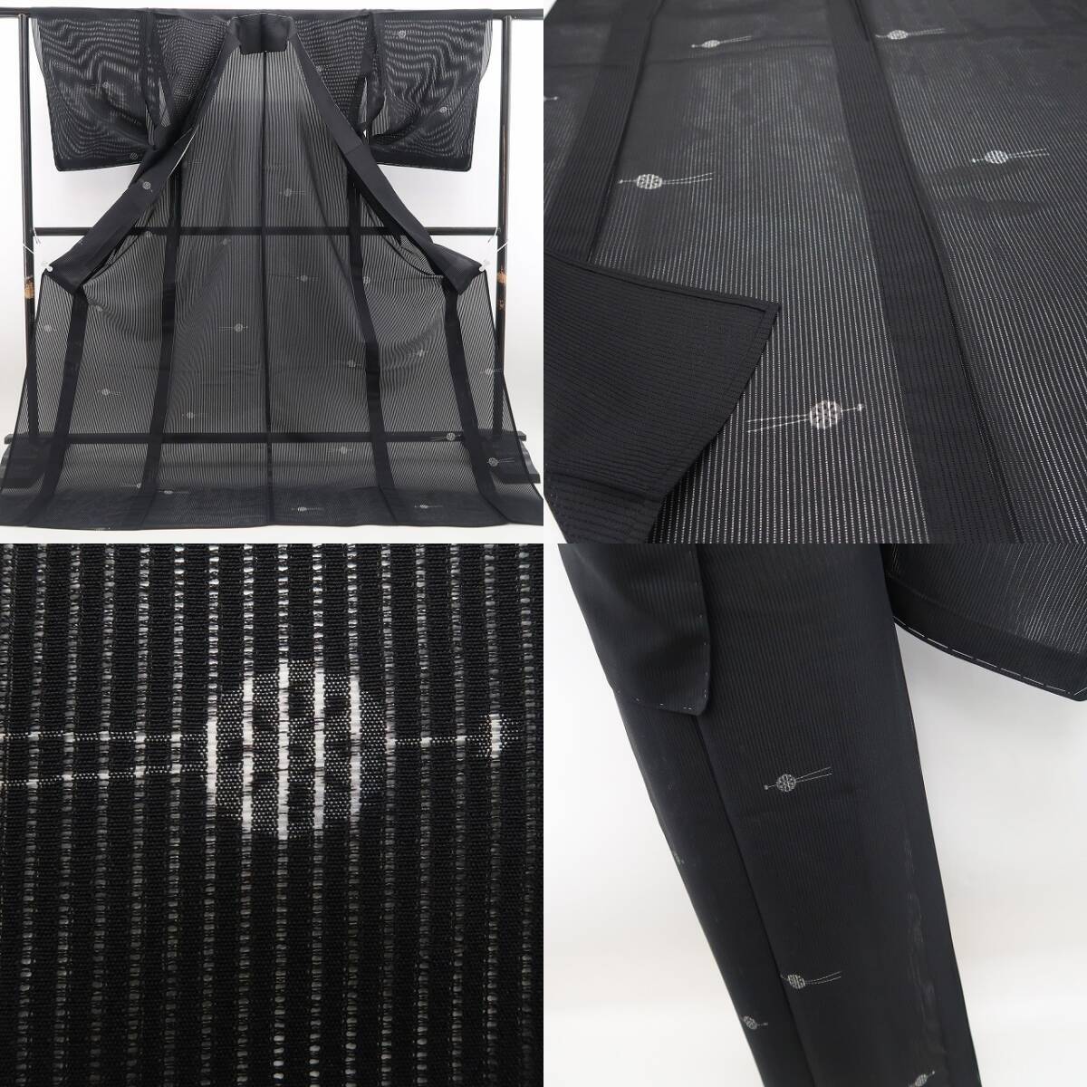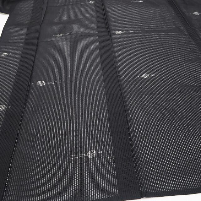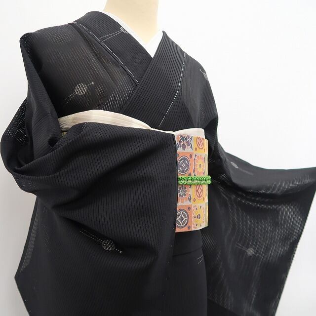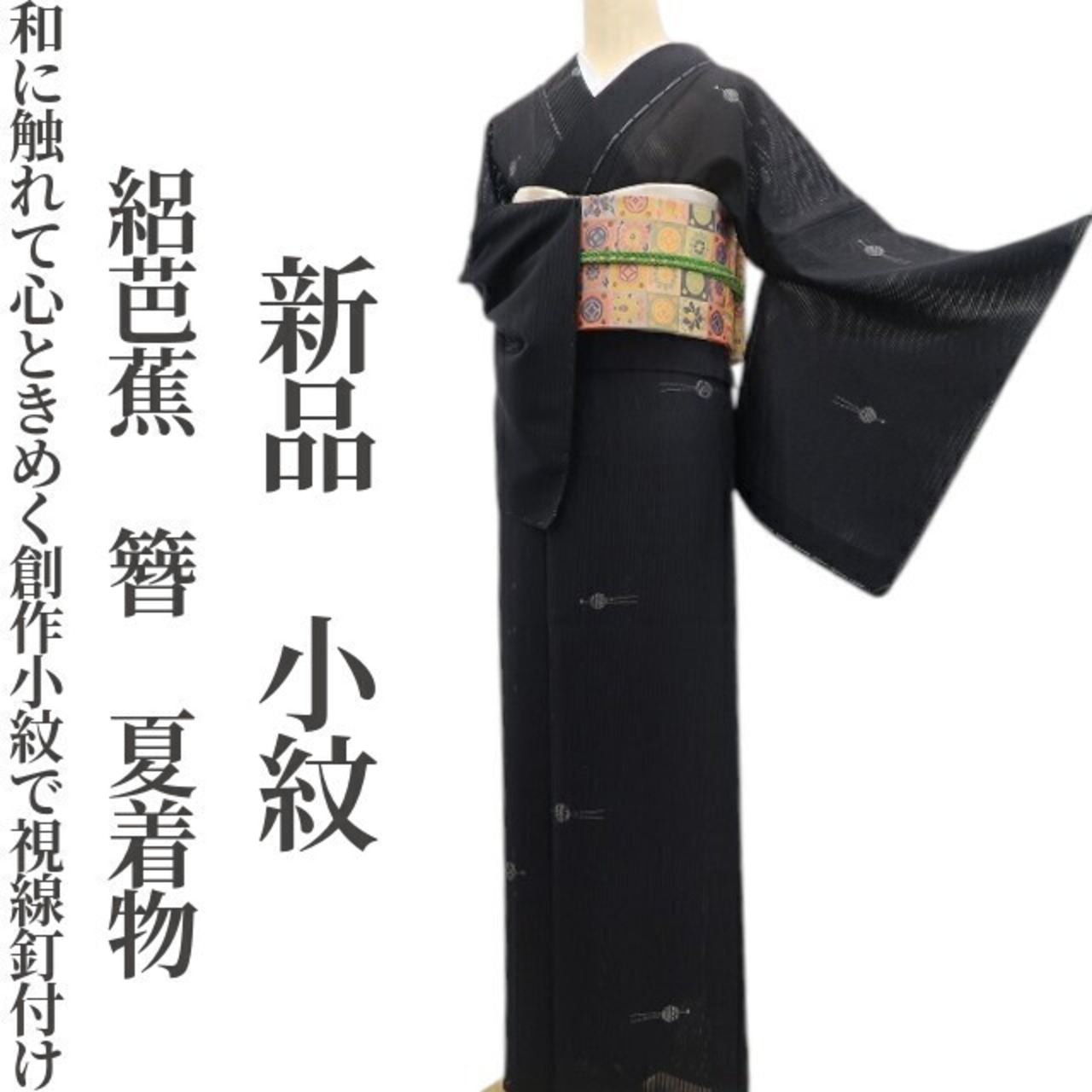落ち着いた黒の涼彩を抜ける心地よい風、巧みな構図で浮かび上がる玉簪のデザインモチーフ、それは絽の透明感に心地よいインパクトを残す素敵な夏の贈り物、高級絹糸が創り出す唯一無二の自然な風合いは正に絽芭蕉ならでは。