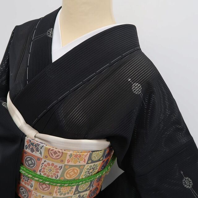 絽のお着物は、二本の経糸を捩りながら緯糸を織り込んだもじり織で、盛夏のお召し物として涼しげでさらりとした生地質が魅力、着る方にもまた見る方にも清らかな風を感じるような涼しさを届けてくれます。
