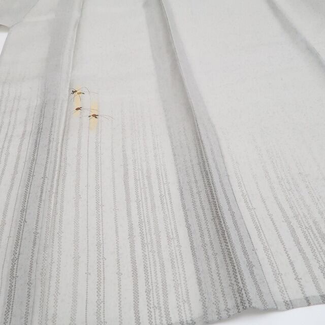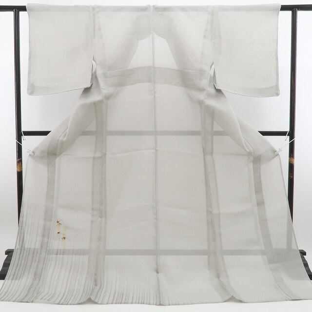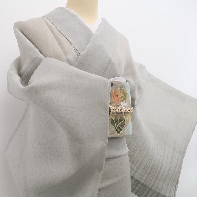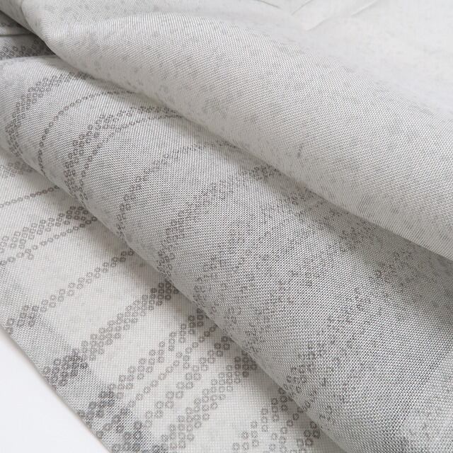 生地感が活きる素朴な蕎麦切色の彩色、縦状の構図に描き込まれた洗練モダンなデザインモチーフ、意匠に醸し出されるこの上ない涼味、それは紗の透明感が映し出す夏着物魅力そのもの…程良い透け感が涼しさを誘いすっきりとした夏のシルエットを創り出します。