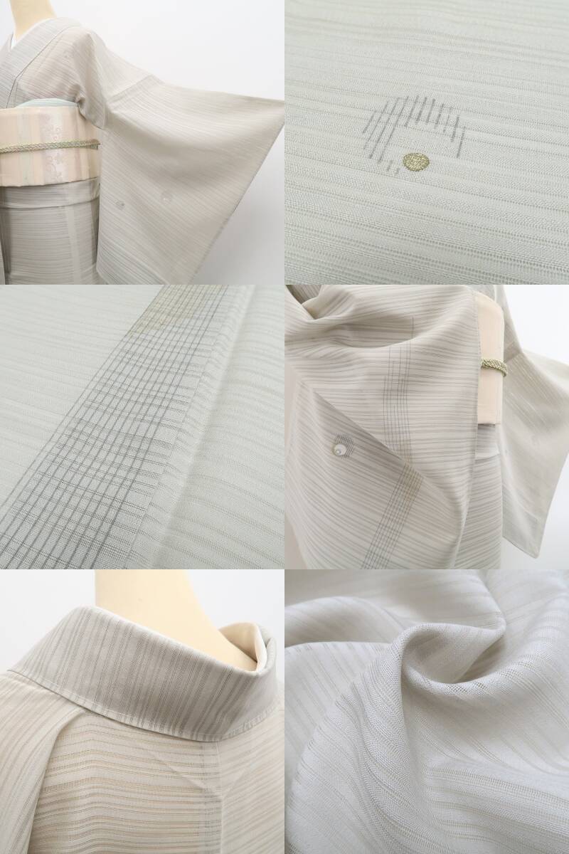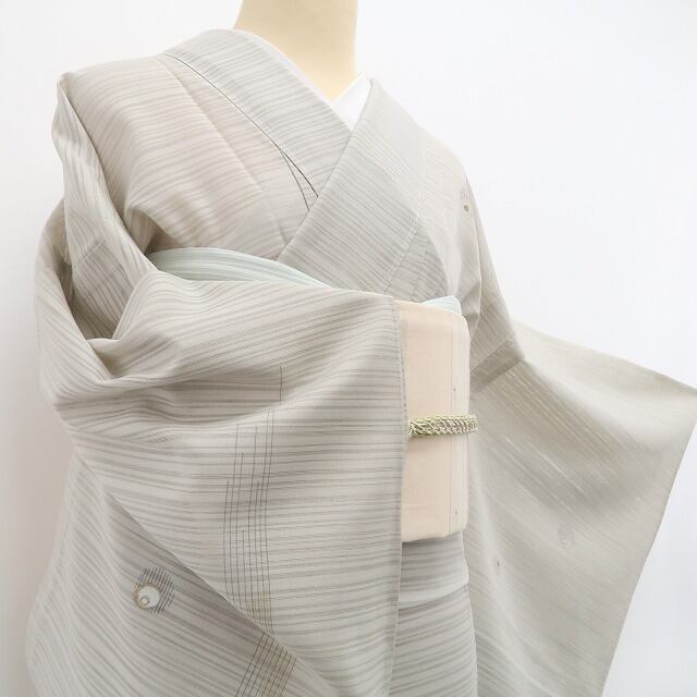 清々しい蕎麦切色の地に引かれた味わい豊かなデザインライン、絽の透明感に巧み構図で散らされた和モダンを趣く艶小柄、洗練の意匠が創り出すえも言われぬお洒落感は格別!それは正に“忘れられない夏の記憶”…これぞ!“いと美しき創作着物の世界”、夏和装をこよなく愛する貴女にお勧め!