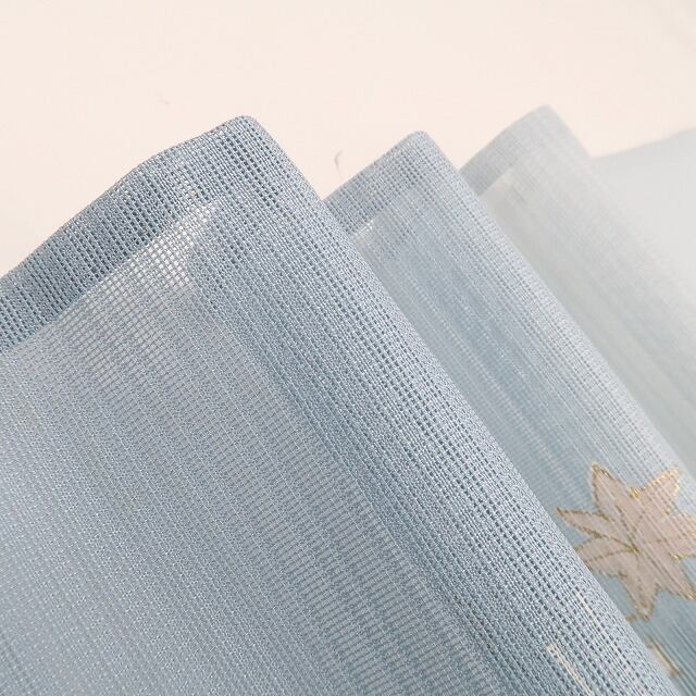 紗は二本の経糸で緯糸一本ずつをからめて織り上げたシンプルなもじり織で絽以上に透け感があり、カジュアルからセミフォーマルまで幅広く着られる夏生地のひとつ、織り柄のある紋紗、紬糸を使った紬紗などがあります。