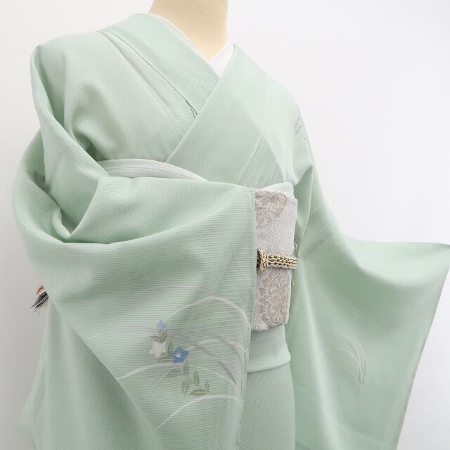 こちらのお着物は、淡くやさしい薄萌葱(うすもえぎ)色の地に、裾や衿へとやわらかに広がる草花模様が添えられた一枚。彩りはごく控えめながらも、丁寧に描かれた花々が、上品な存在感を放ちます。