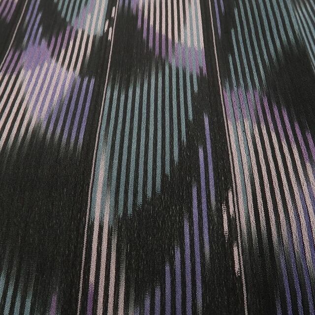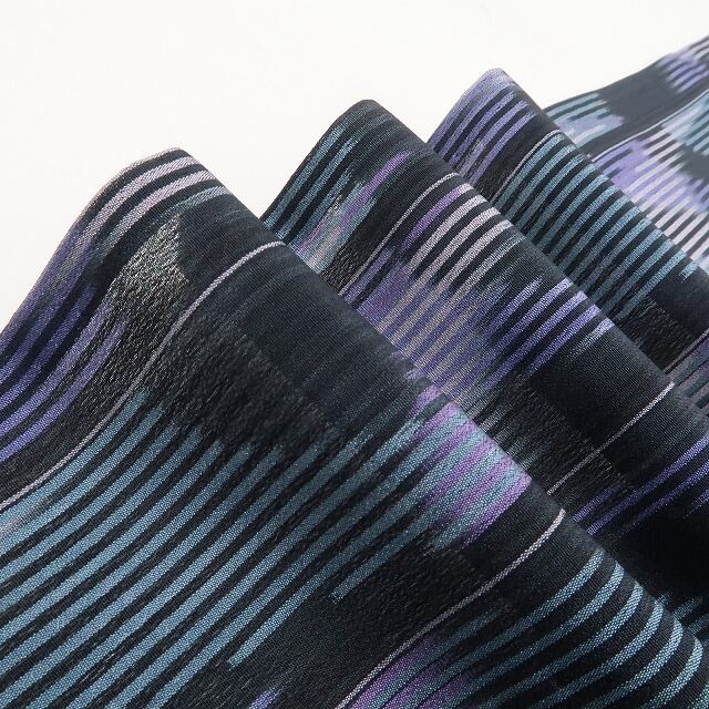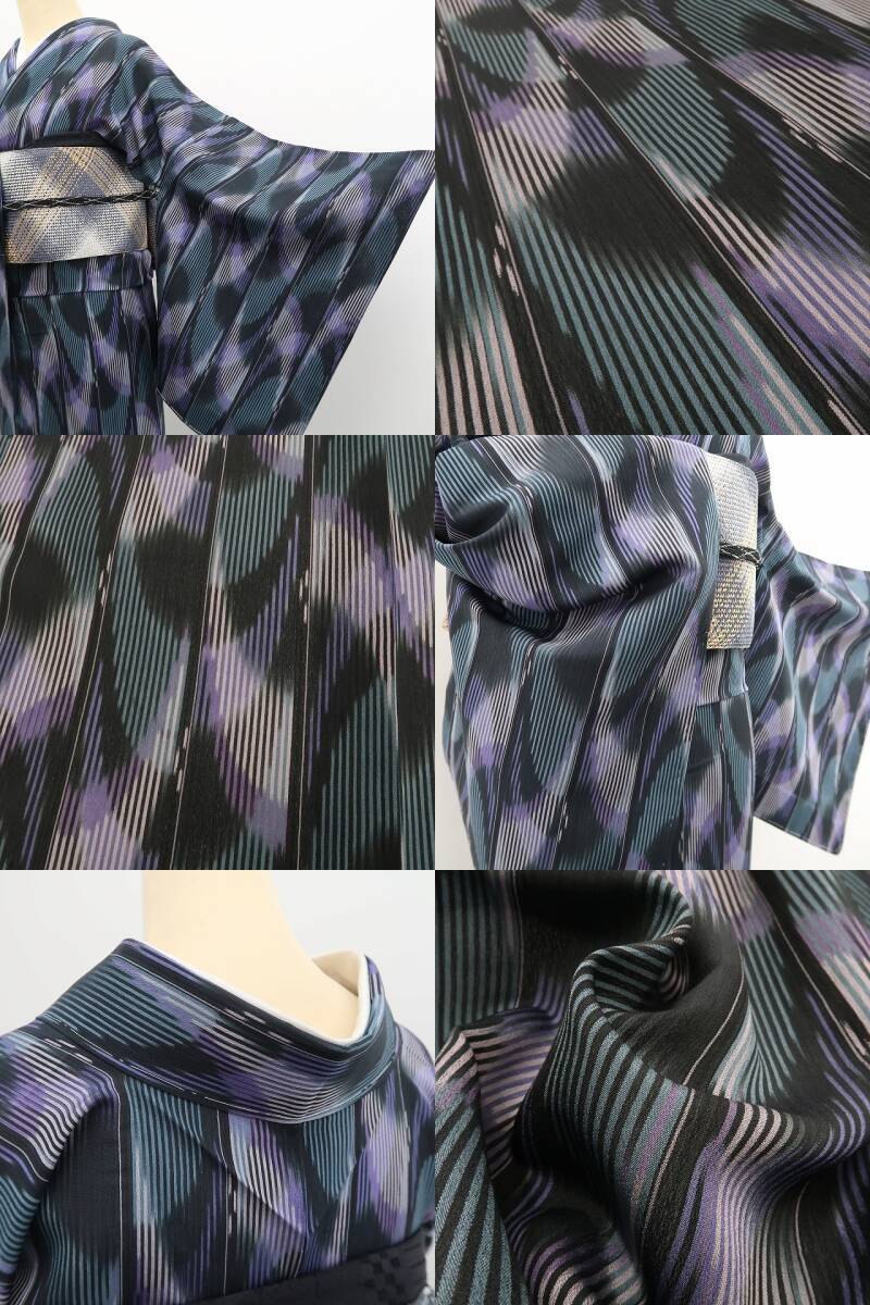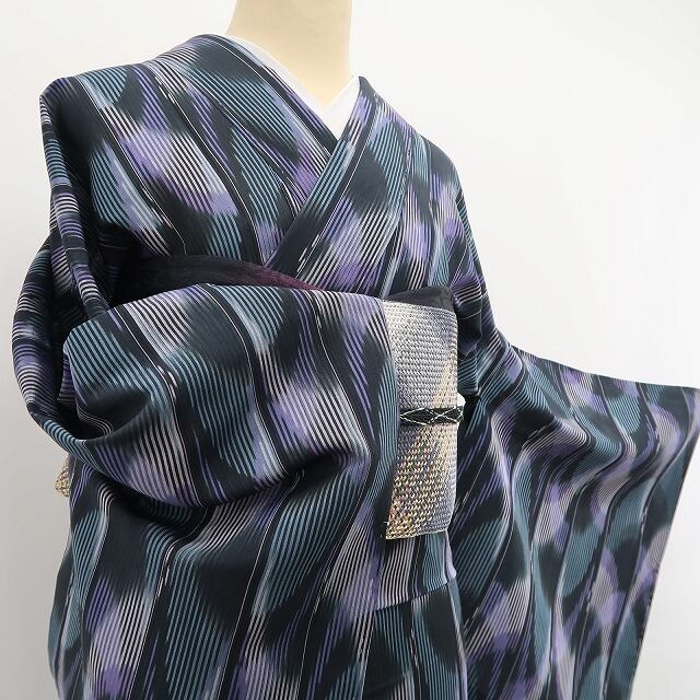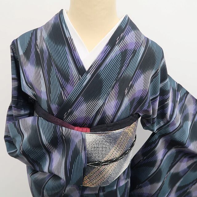 幾何学模様の中に潜む細やかな縦縞が全体に表情を添え、モダンでありながらも品のある着姿を叶えます。