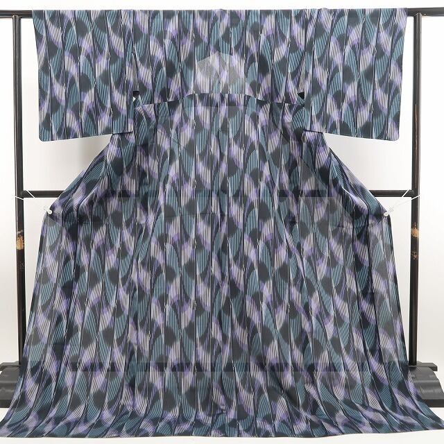 こちらのお着物は、黒地に幾何学模様が織りなす、涼やかで洗練された夏の一枚。