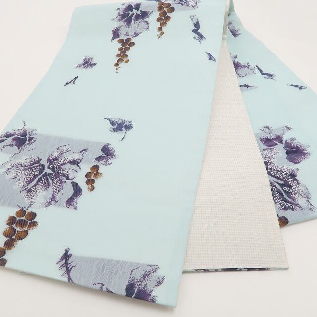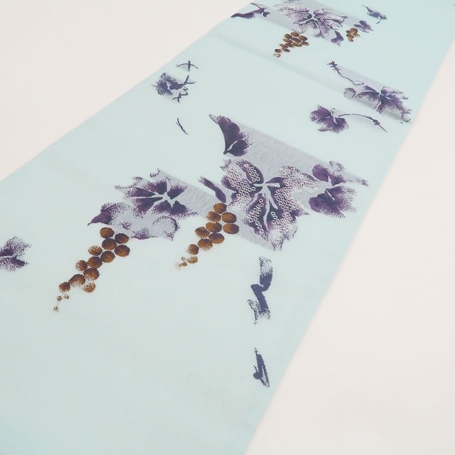 白藍色の紗地に葡萄柄をあしらった、上品な紗の袋帯でございます。