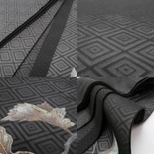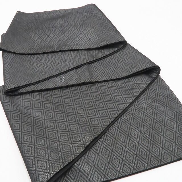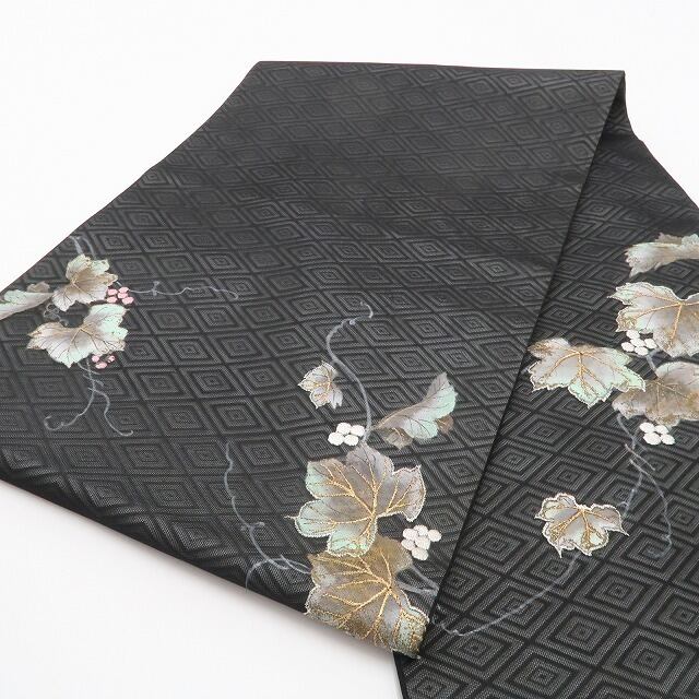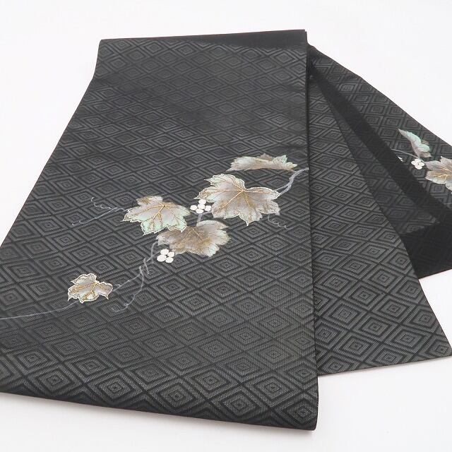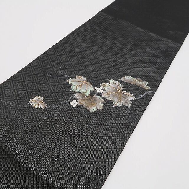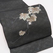黒地の紗に、蔦と入れ子菱が凛とした表情を添える、上品な袋帯でございます。
