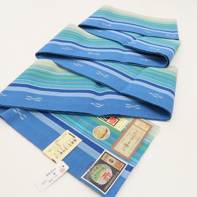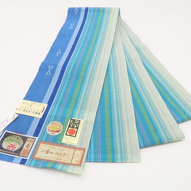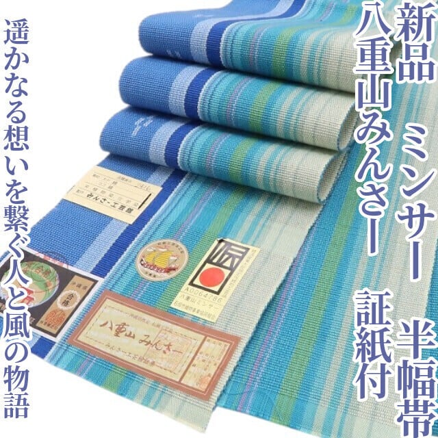 古くから“永遠の愛の証”として受け継がれる沖縄八重山地方の伝統工芸“ミンサー織”、先人の想いが込められた八重山みんさー/証紙付の“半幅帯”でございます。