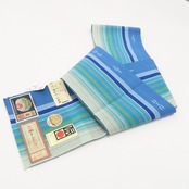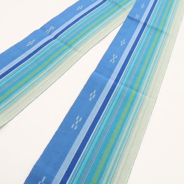 群青色と納戸色の色糸が創り出す爽やかな風、素朴な綿の素材感にミンサー織独特の四角い絣柄が奏でる織の真心、それは正に歴史が繋ぐ“人と風の物語”、“さぁ!締めて体感!今日から貴女も風の旅人”、その使い勝手の良さに思わず手が伸びる“お気に入り”となることでしょう。