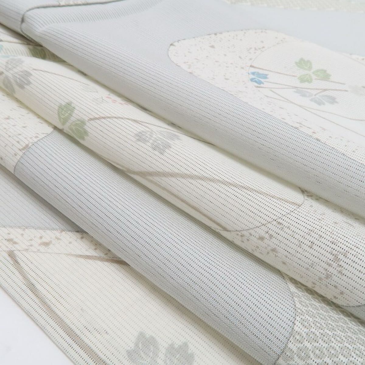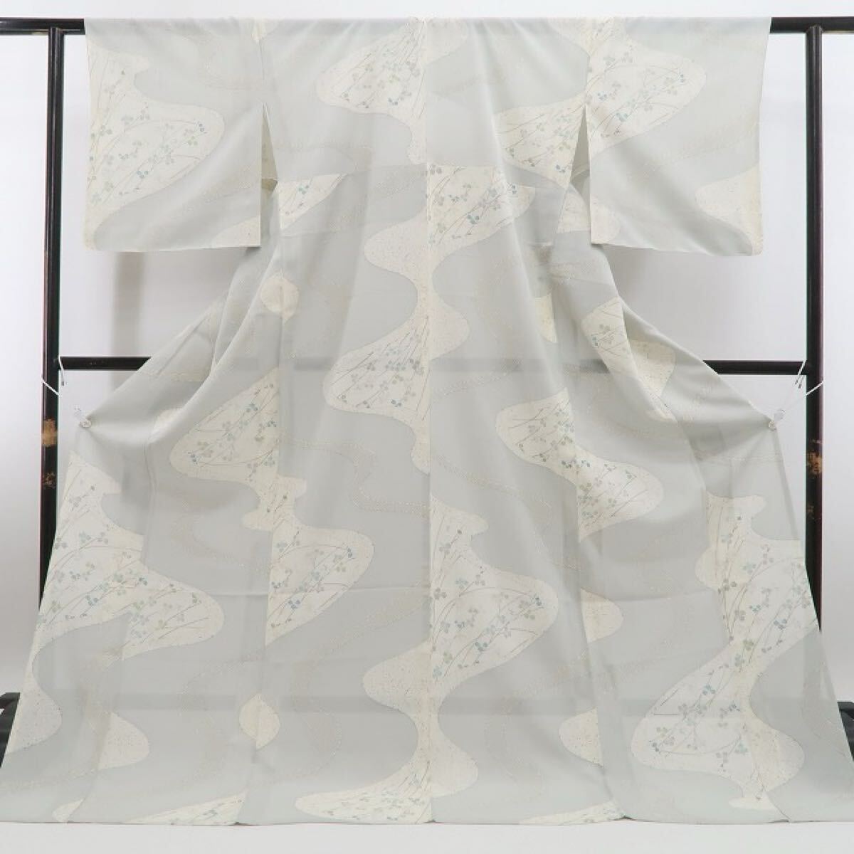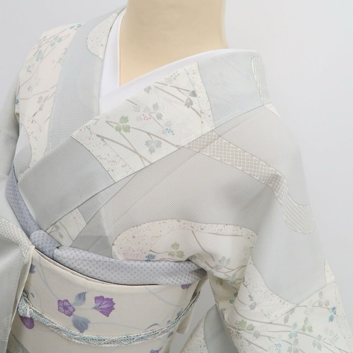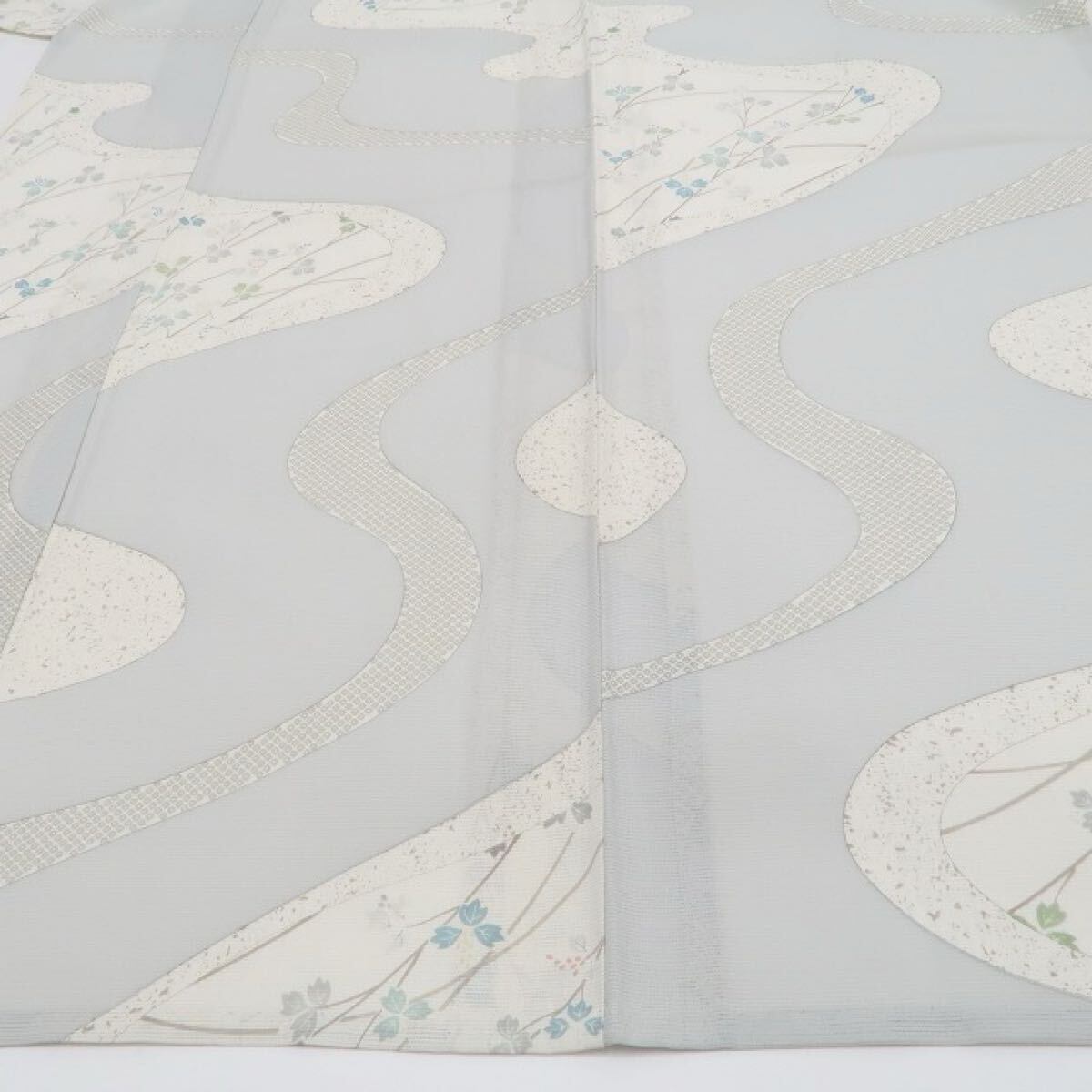 灰青色の色地を抜ける爽やかな風、全面に描き込まれたモダン花葉のデザインモチーフ、意匠に醸し出されるえも言われぬお洒落感は必見!それは絽の透明感が映し出す“小粋な風と和の香り”…程良い透け感が涼しさを誘いすっきりとした夏のシルエットを創り出します。