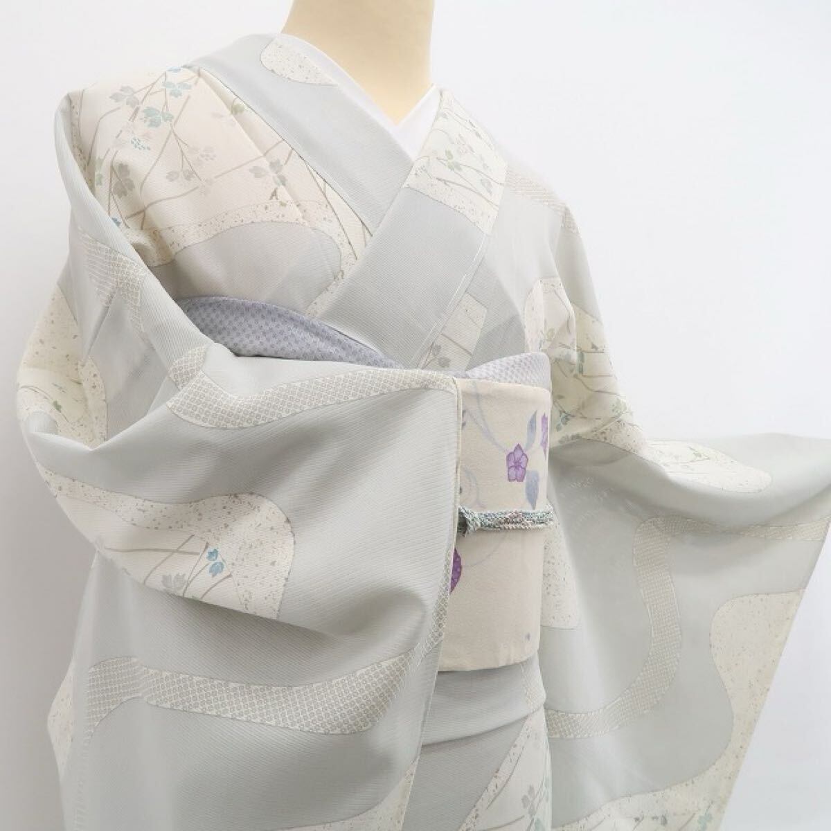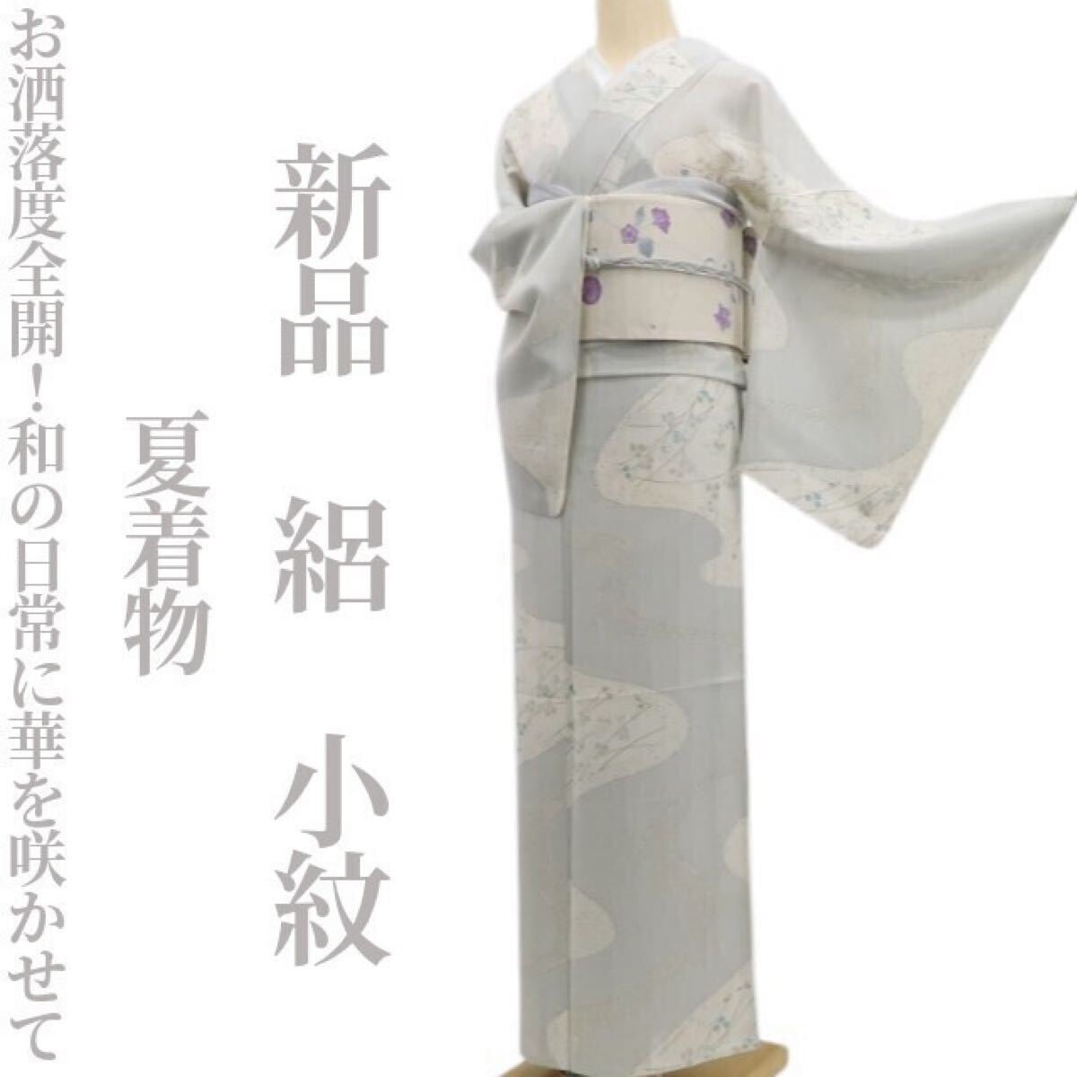 こちらのお着物は、ライトグレイッシュトーンの彩色でお洒落小紋の親しみやすさにフォーカスした和モダンな創作模様を込めています。夏着物の透明感とともにさりげないセンスを表現するのに最適!モダン創作着物は、お洒落を楽しむお召し物として、また和装の幅を広げる意味からも一枚お手元に置かれると重宝します。