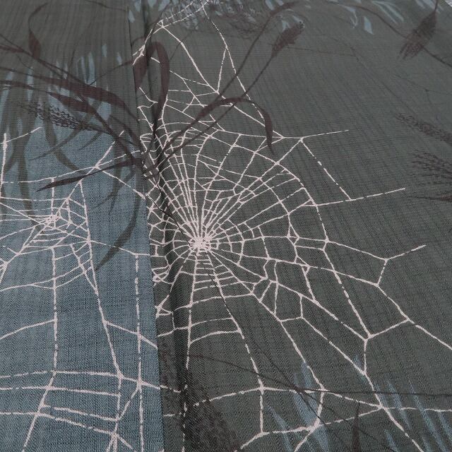 こちらのお着物は、錆納戸色と高麗納戸色の深みある地色に、ススキと蜘蛛の巣が描かれた一枚。