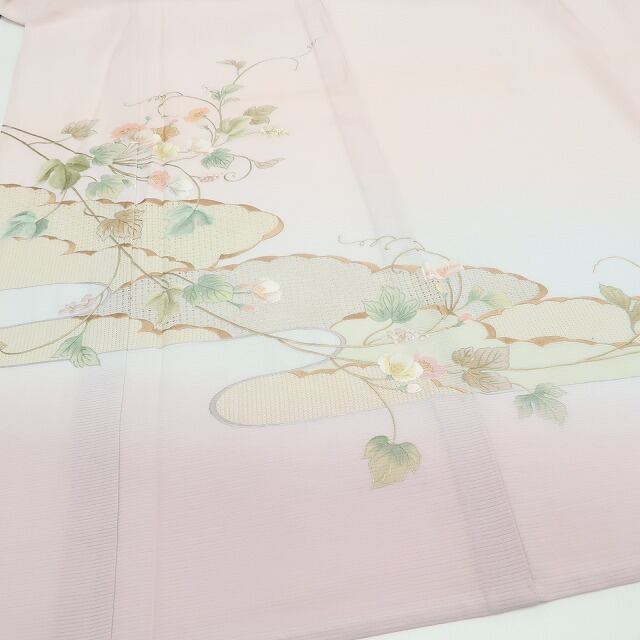 伸びやかに絡む蔓、優雅に咲き誇る花々の姿が繊細な刺繍で丁寧に表現され、淡くやさしい撫子色の地に華やかさを添えています。