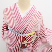 生成り地に赤と赤紫のストライプが並ぶ、ポップで愛らしい雰囲気の一枚。