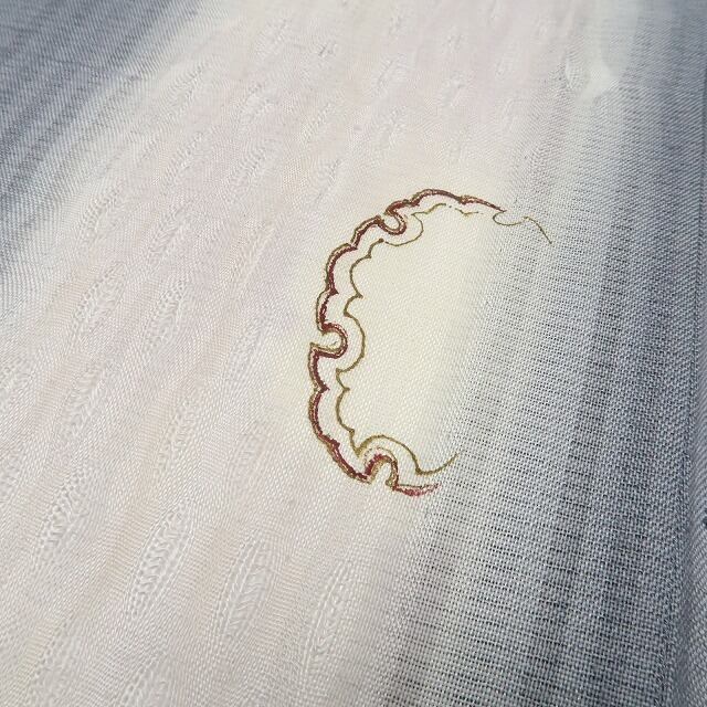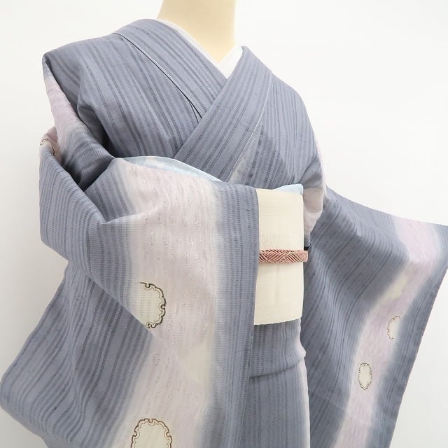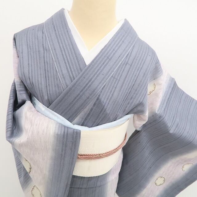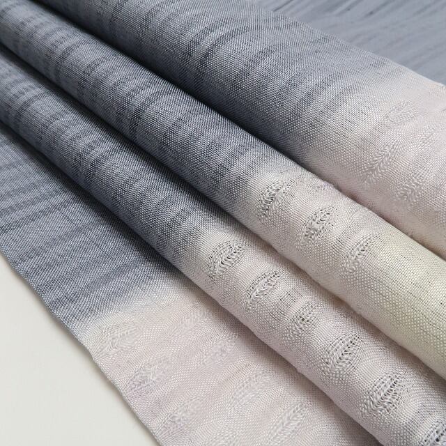 糸の一本一本にゆらぎを与え、手仕事ならではの幻想的な濃淡を浮かび上がらせる櫛引き織。そこに雪輪が静かに咲き、まとう人の涼やかさを引き立てます。