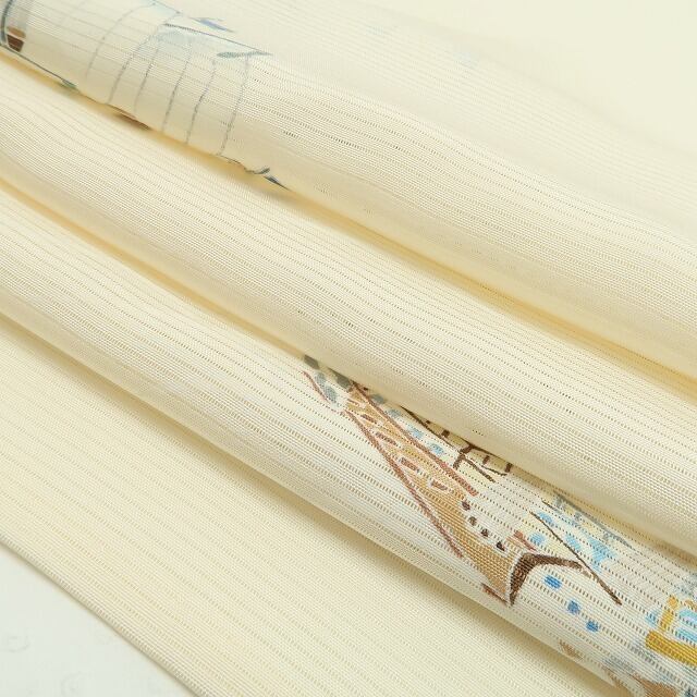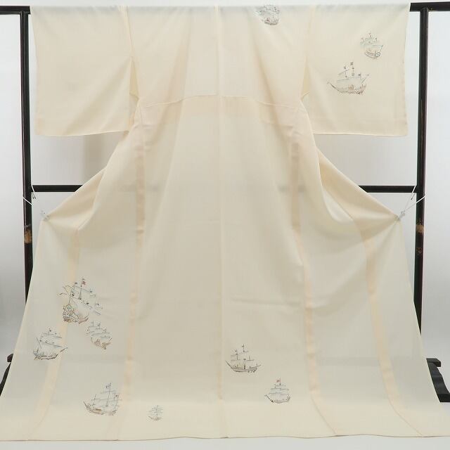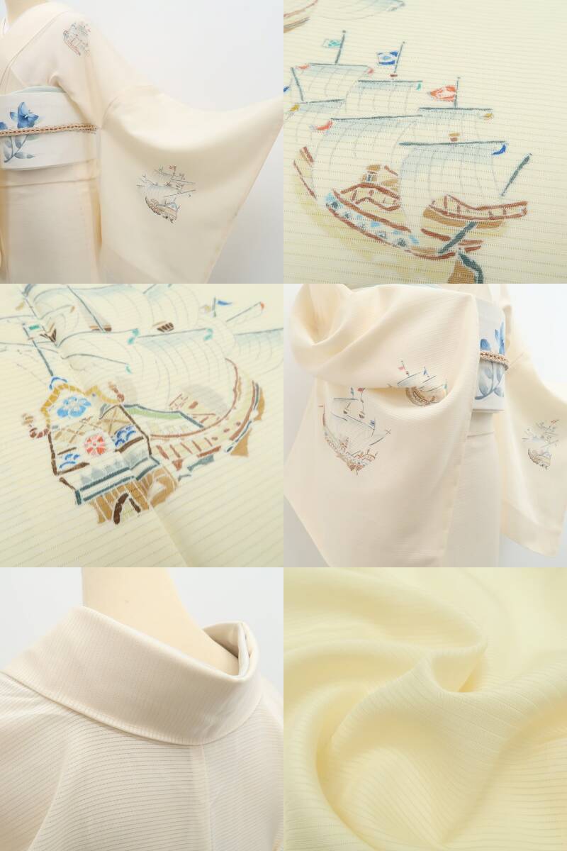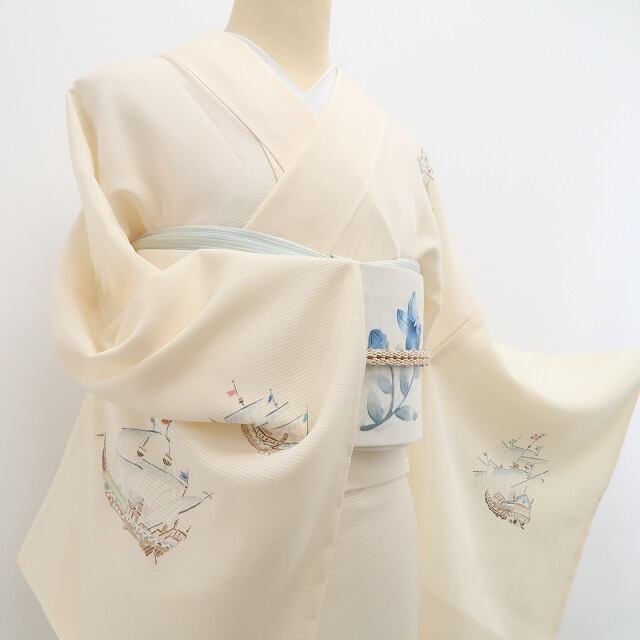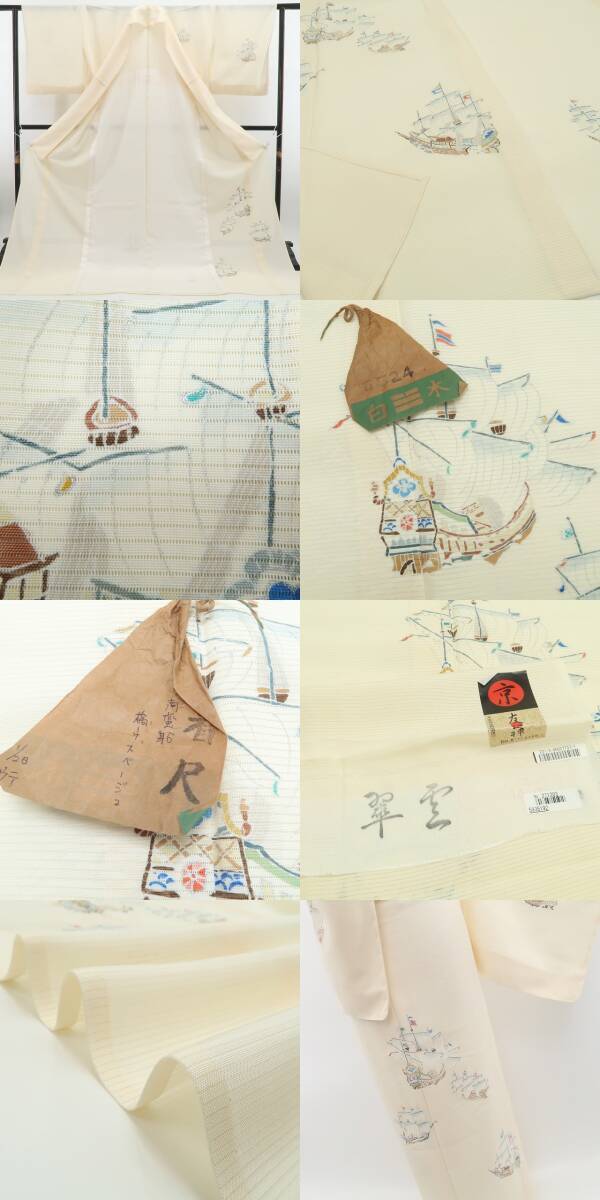 こちらは、鳥の子色の絽地に南蛮船が描かれた、白木染匠による訪問着。