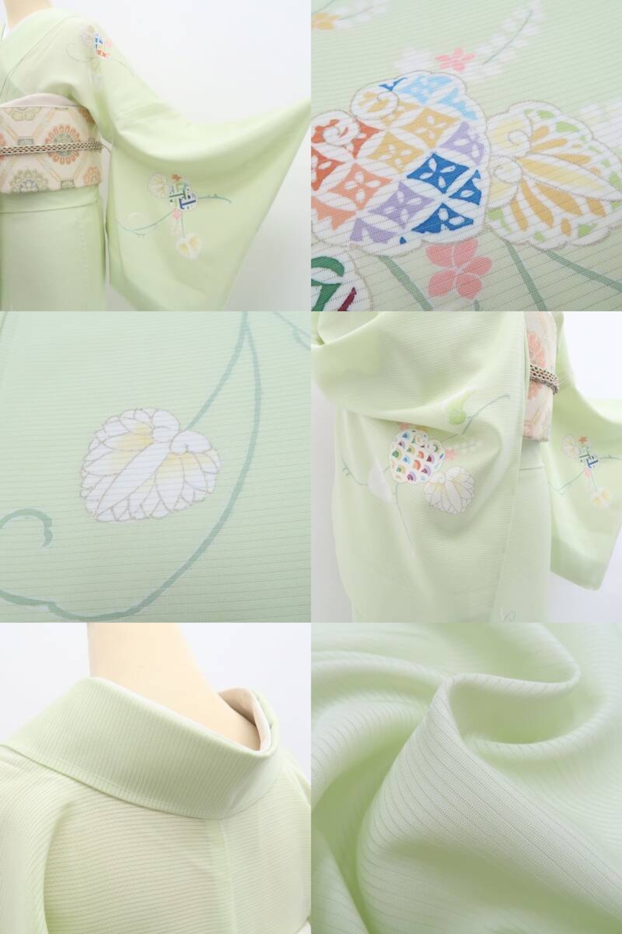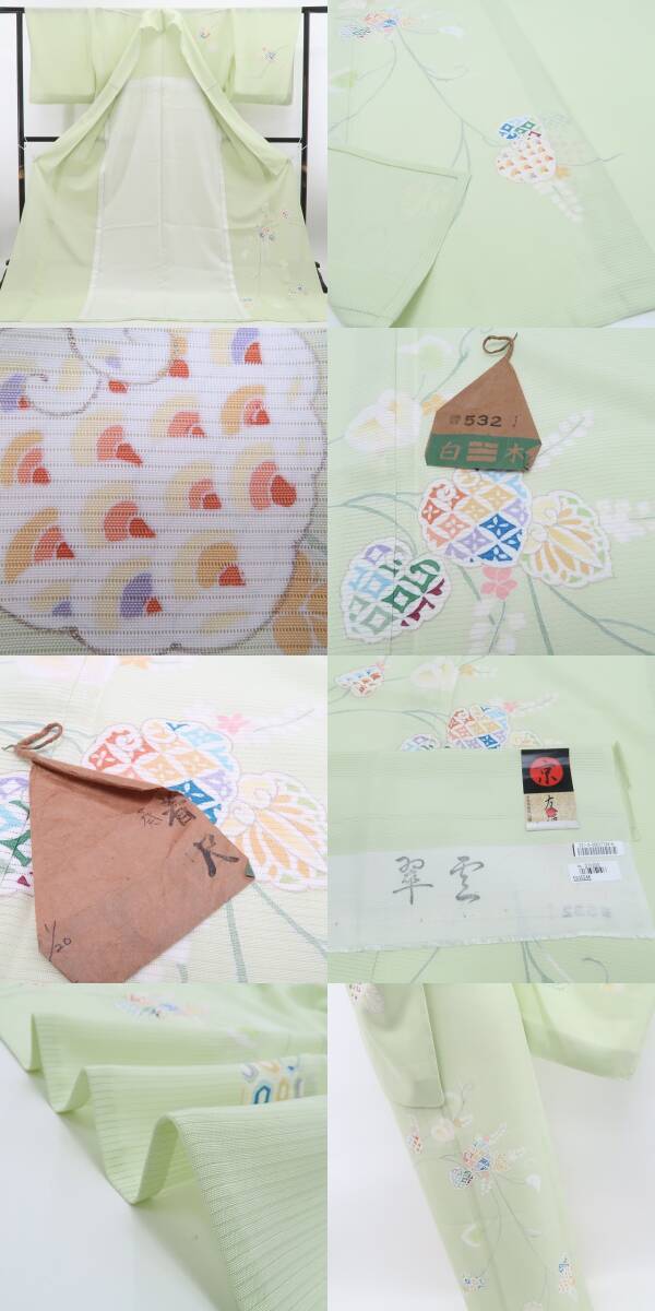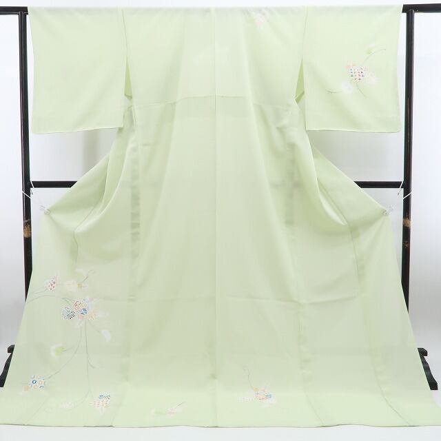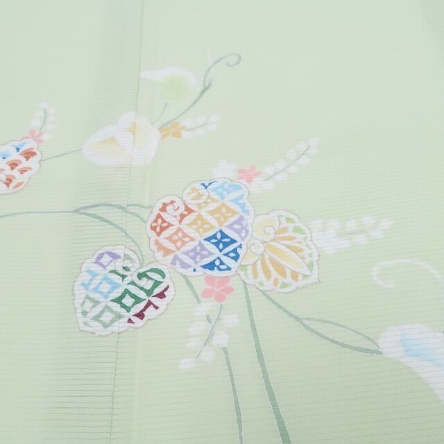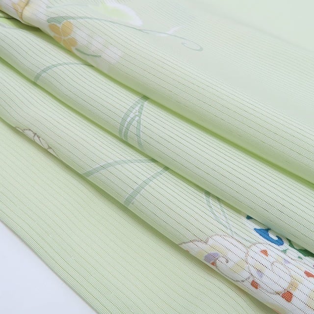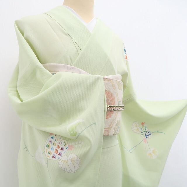 こちらのお品は、若葉色の絽地に京友禅で描かれた華文が印象的。