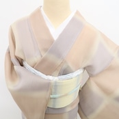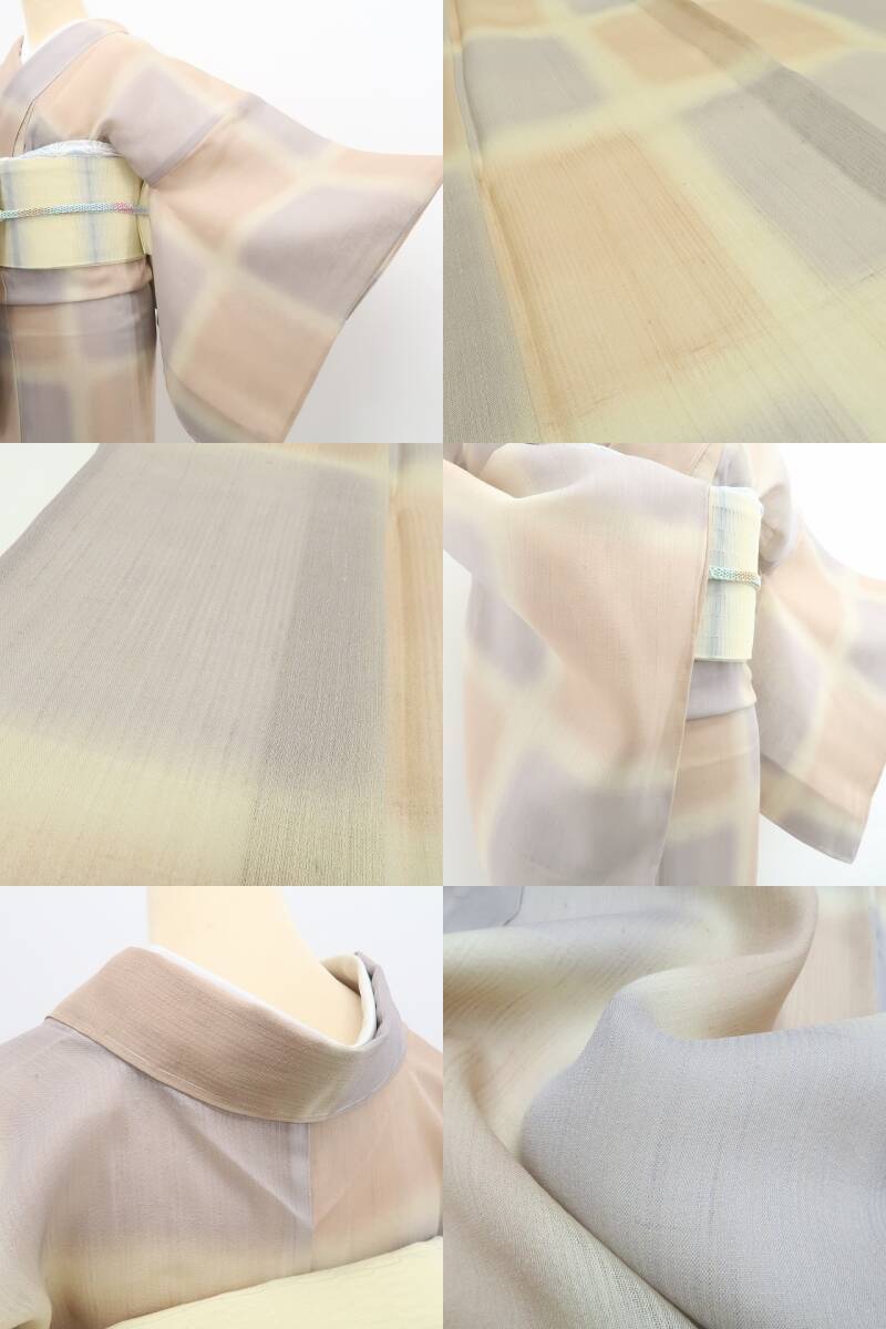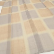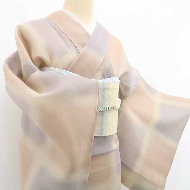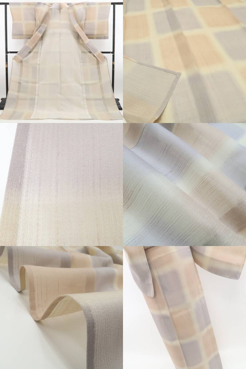 白茶色と薄鼠色の涼やかな色味で描き込まれた彩り格子の洒落模様、紗の透明感に馴染みの格子柄が醸し出す心地よい風!“粋な格子で風誘い香りほのかに涼を挿す”、季節の装いに…紬ならではの軽くしなやかな着心地と裾さばきの良さにきっとご満足いただけることでしょう。