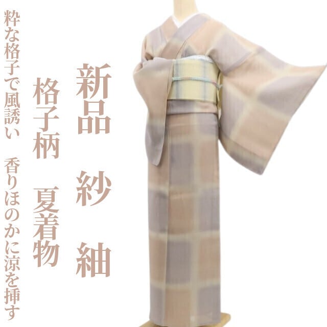新品 紗 格子柄 夏着物“粋な格子で風誘い香りほのかに涼を挿す”正絹 仕付け糸付 紬 6521