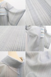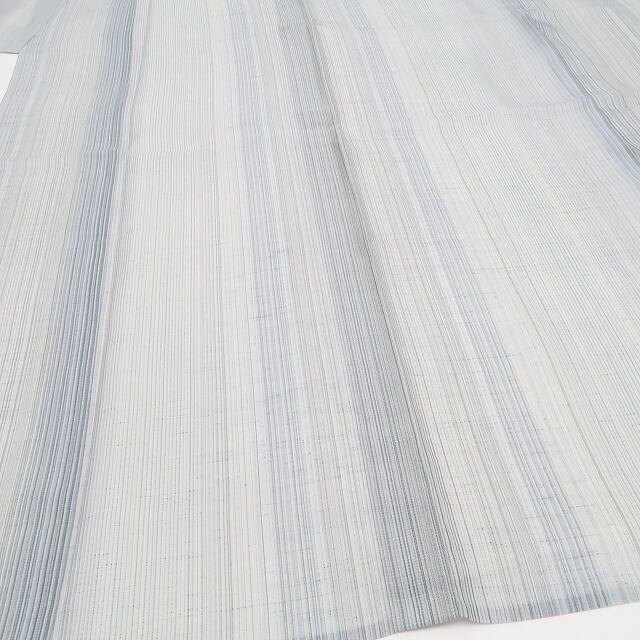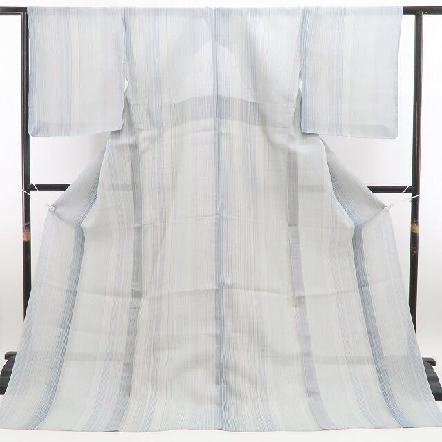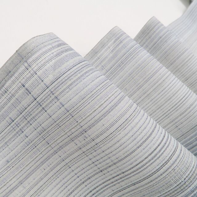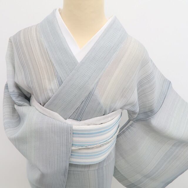 優しい灰青色の地に紡ぎ出された味わい豊かな縦縞模様、紗の透明感にアシンメトリーなデザインラインが創り出すその表情は“涼を趣く夏着物の魅力”そのもの、自然味溢れる素材感とセンスの中にもこだわりが感じられるひと品、季節の装いに、お奨めです。