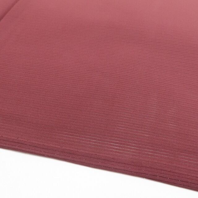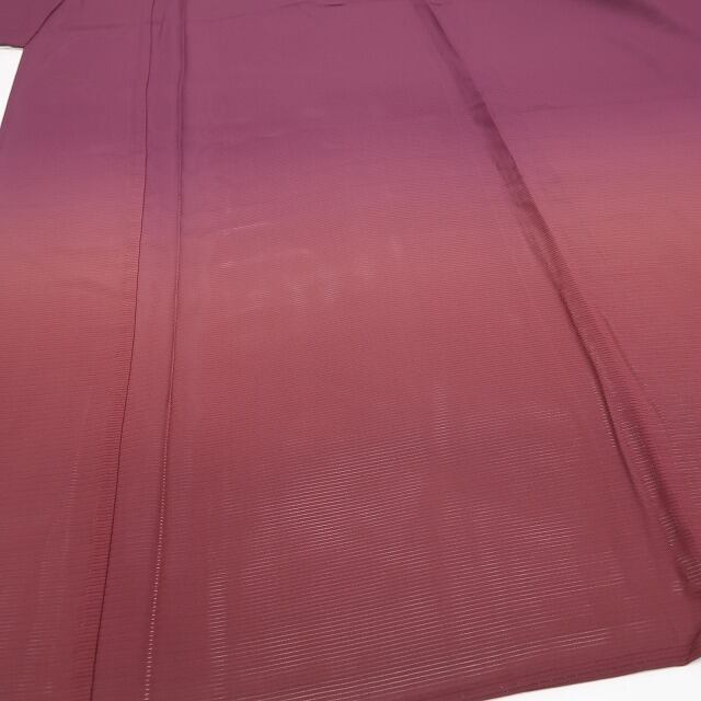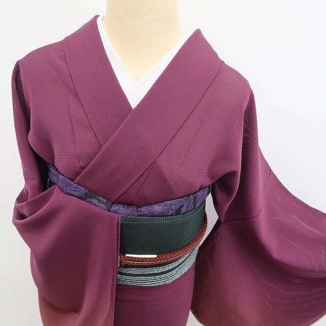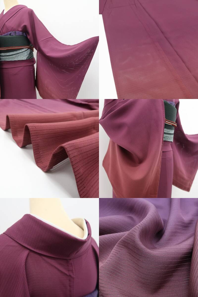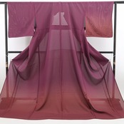 本場泥染の技が活きる梅紫色と浅蘇芳色の彩色、絽の透明感に暈しの濃淡が醸し出すえも言われぬ大人びた艶、それは正に“大人を振りほどく和の眼差し”そのもの、柄行を微細なコントラストでシンプルモダンに表現したひと品、正絹素材のしっとりとした風合いが着物の味わいを一段と馴染みやすい趣に変えています。