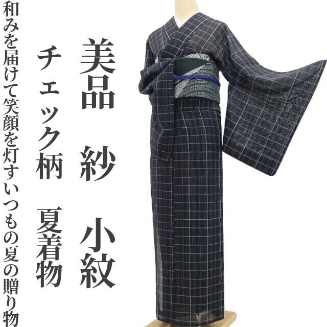 美品 紗 チェック柄 夏着物“和みを届けて笑顔を灯すいつもの夏の贈り物”正絹 小紋 6535