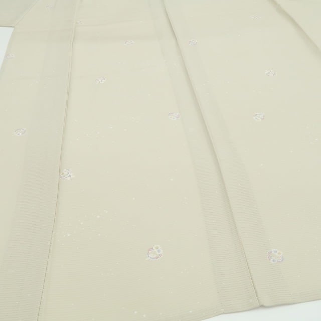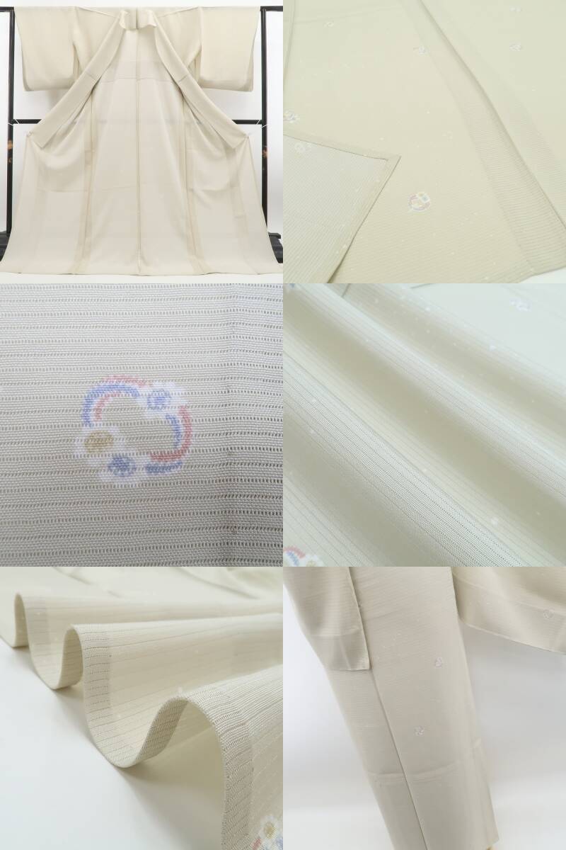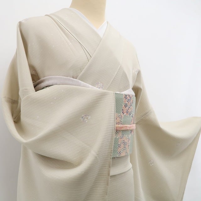 こちらのお着物は、練色の絽地に小ぶりな花の意匠がふわりと浮かぶ一枚。
