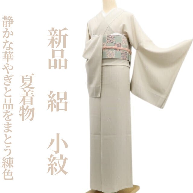 新品 絽 夏着物 正絹 仕付け糸付“静かな華やぎと品をまとう練色”小紋 6540