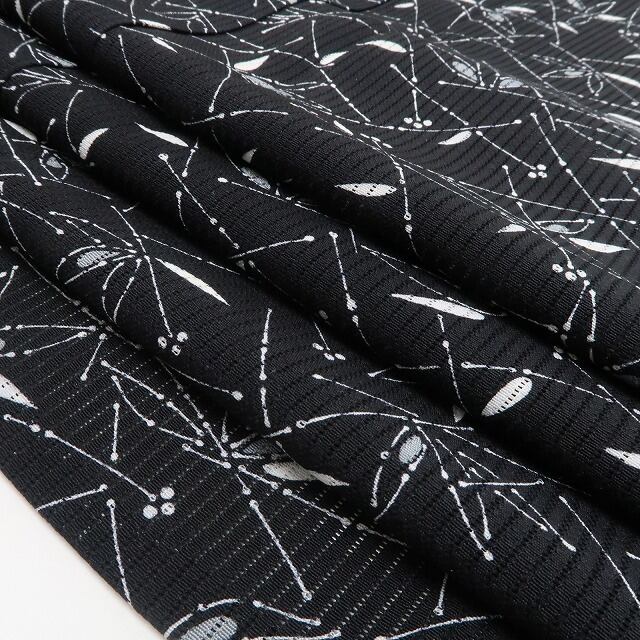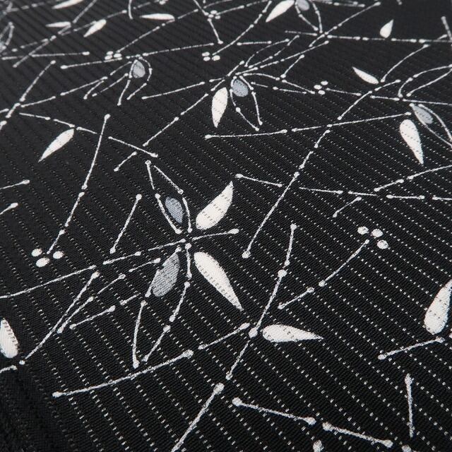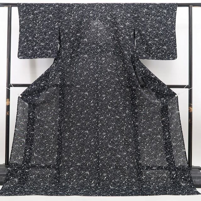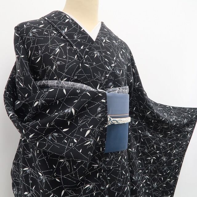 丸みを帯びた黒の色地全面を覆い尽くすデザイン笹葉の色模様、絽の透明感にモダンな意匠が醸し出すえも言われぬお洒落感!シンプルにそしてダイレクトに夏小紋の愉しみ方を届けてくれるひと品、それは貴女を包む“いつもと違う夏の高揚”、お奨めです。