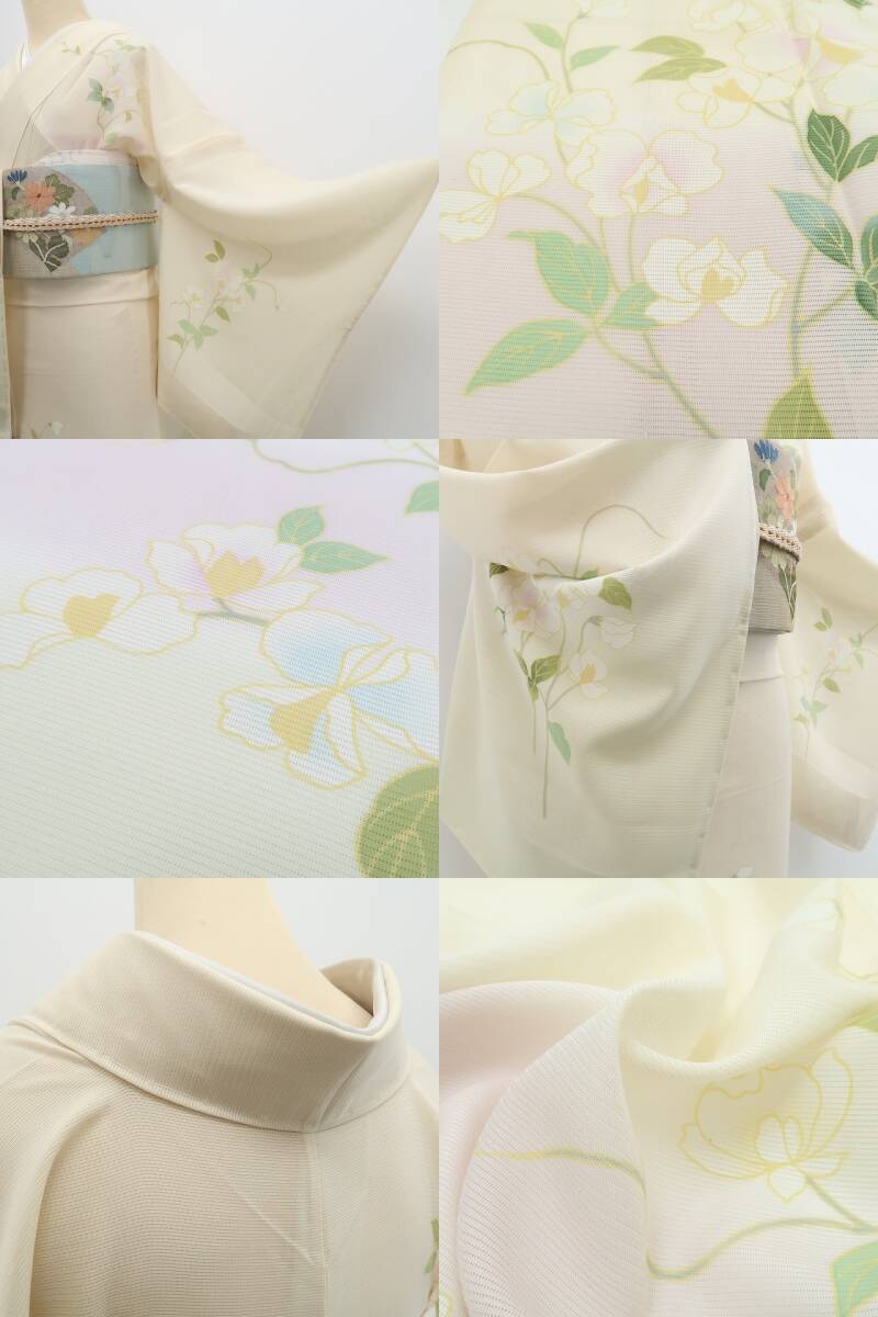 丸みある鳥の子色の彩色が誘う大人びた艶、絽の透明感に慎ましく色を挿す可憐な胡蝶蘭のデザインモチーフ、丸みのフォルムに醸し出される「夏の華やぎ」は必見の価値あり!創作着物の奥行を楽しむ日本人の美意識が活きたひと品、正に夏着物ならではの魅力が趣豊かにに表現されています。