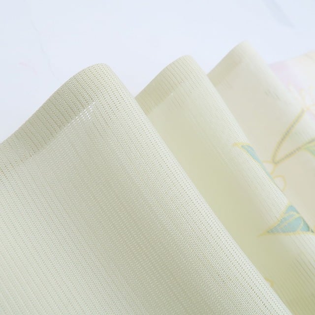 絽は、絽目の違いによりヨコに目を通した横絽と、タテに通した堅(縦)絽に分けられます。タテ糸とヨコ糸を交互に絡み合わせて組織するのが平絽、駒撚りに糸で織り上げた絽を駒絽といいます。駒絽は平絽より、しっかりとした手触りで現在の絽の多くがこれにあたります。