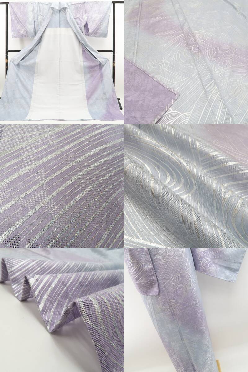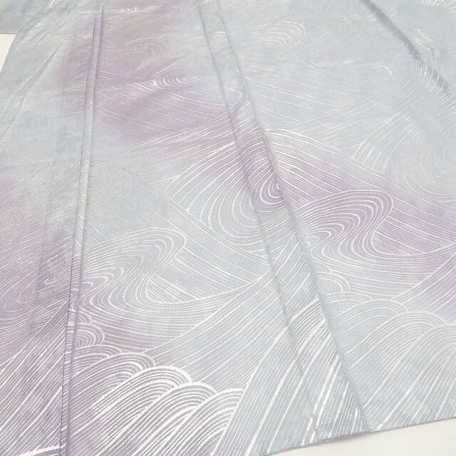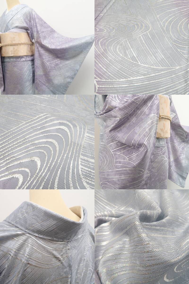 灰青色の落ち着きに竜胆色の奥行きが映え、銀彩友禅の光がそっと華やぎを加える……そんな控えめながらも確かな存在感は、大人だからこそ楽しめる贅沢。