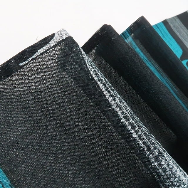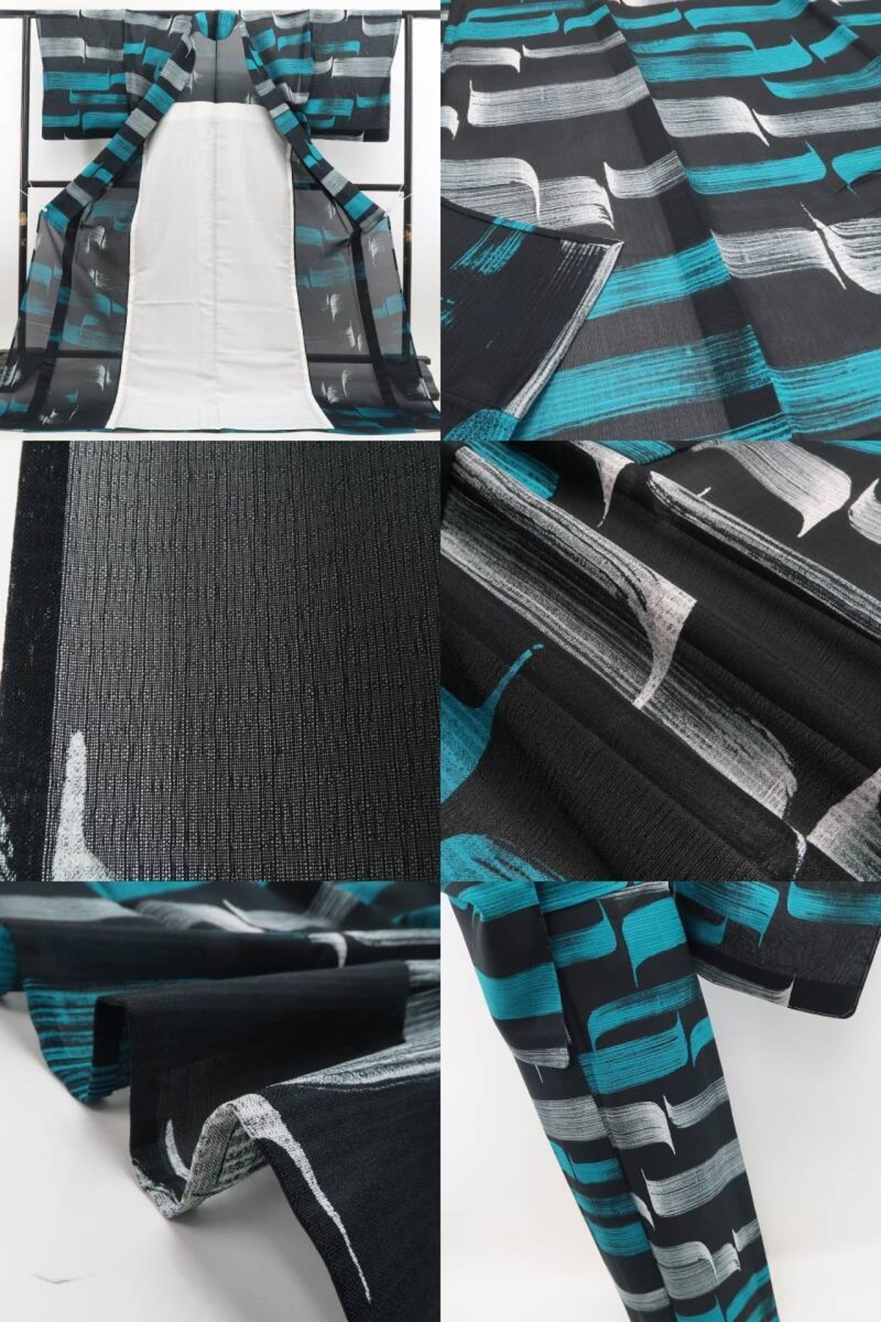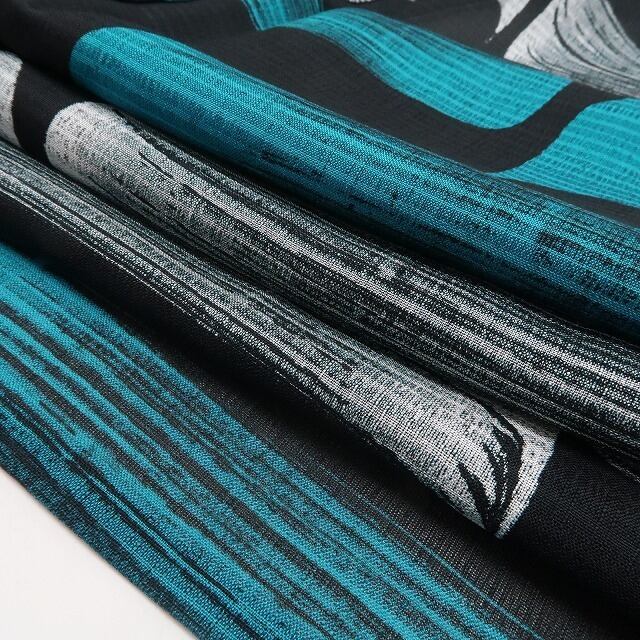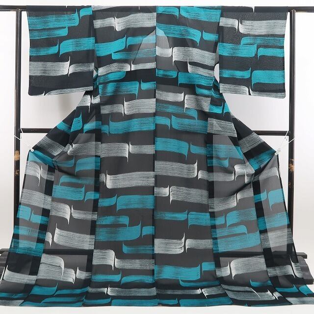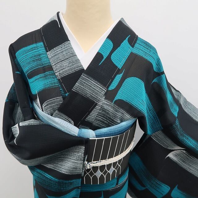 本場白泥染の技が活きる黒・納戸色・白の彩色、紗の透明感に横段の構図で色を挿すアブストラクトなデザインモチーフ、意匠が醸し出すえも言われぬ大人びた艶、それは正に“大人を振りほどく和の眼差し”そのもの、柄行を微細なコントラストでシンプルモダンに表現したひと品、正絹素材のしっとりとした風合いが着物の味わいを一段と馴染みやすい趣に変えています。
