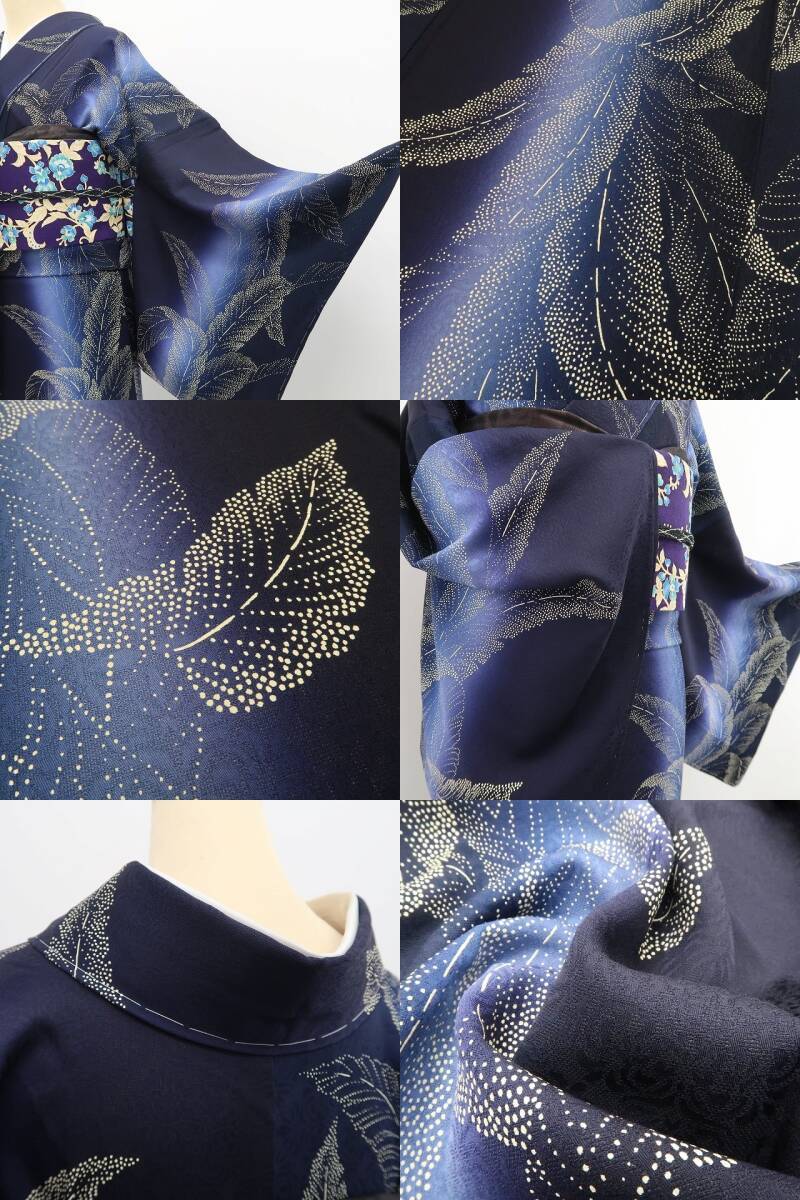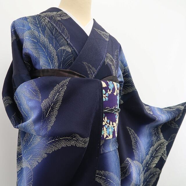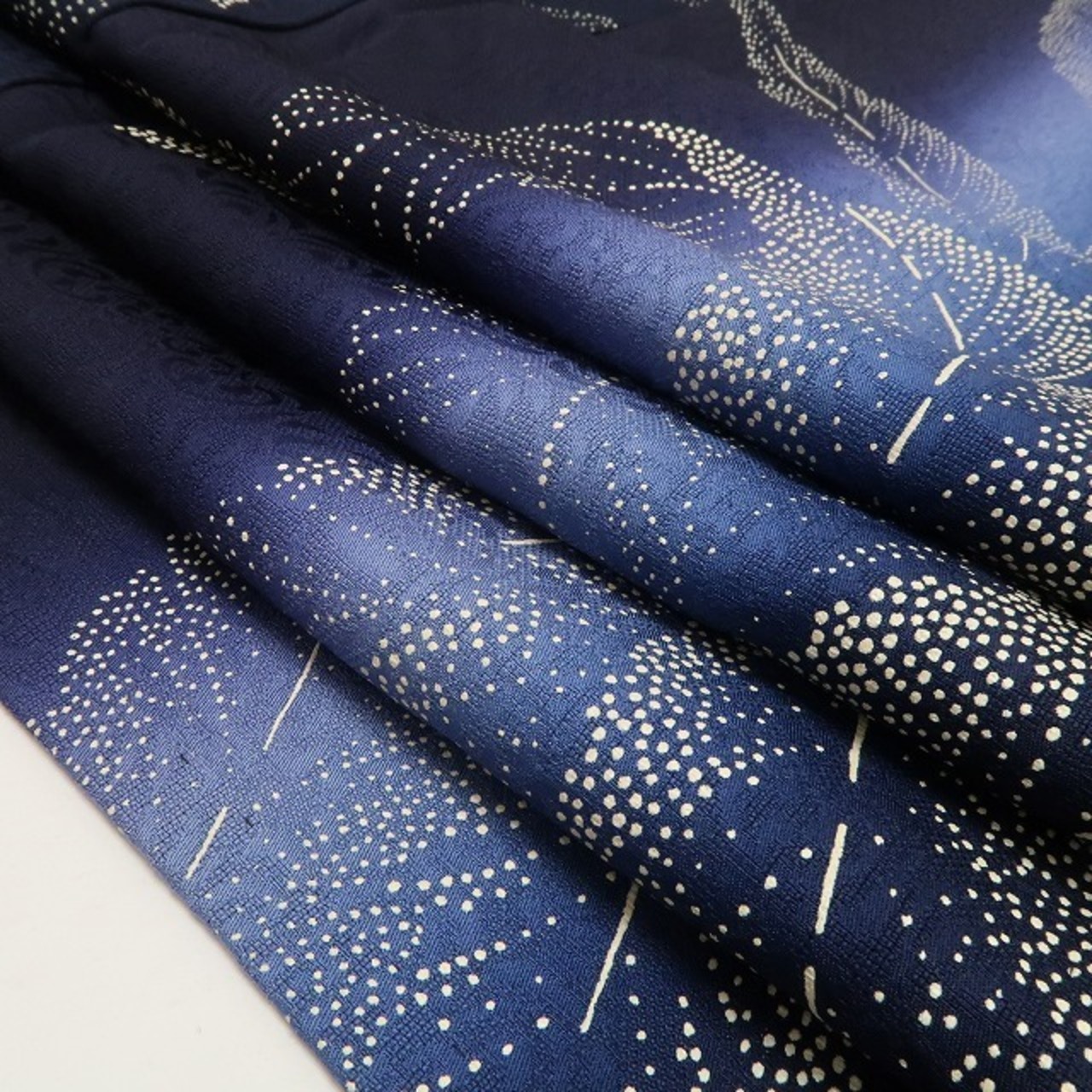 深みある藍鉄色の地が誘うこの上ない大人びた表情、暈しのコントラストに縦状の構図で繋がれた艶めいた葉模様の流線デザイン、どこかミステリアスな趣を醸し出す紋紗のひと品、それは貴女を包む“いつもと違う夏の高揚”…程良い透け感が涼しさを誘いすっきりとした夏のシルエットを創り出します。