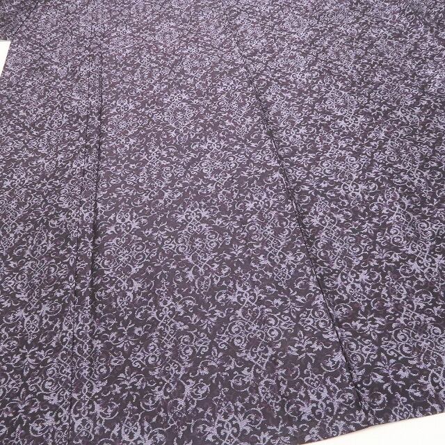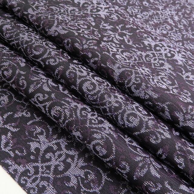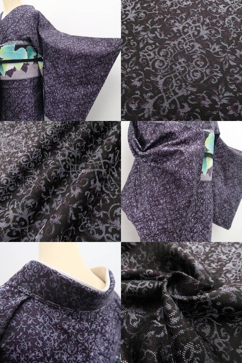 大人びた葡萄色の濃淡全面に描き込まれた精微な華文のデザインモチーフ、洗練の創作模様が醸し出す何とも言えないお洒落感、巧みな構図で交差するその表情は必見の価値あり!シンプルながらダイレクトにセンスの良さを感じさせてくれるひと品…お召独特のしっとりとした風合いが着物の味わいを一段と馴染みやすい趣に変えています。