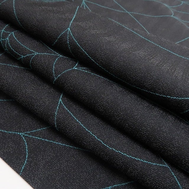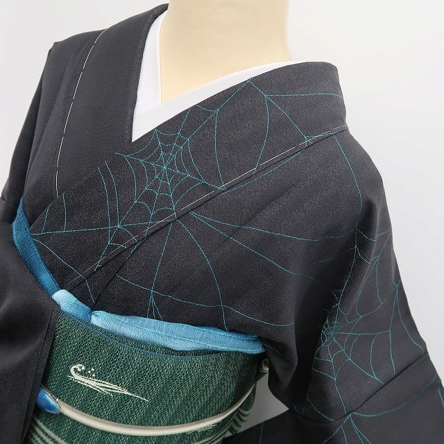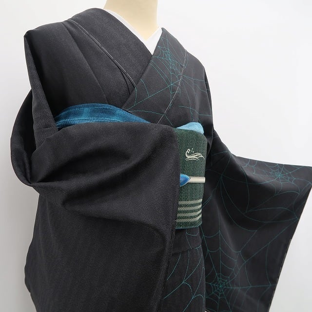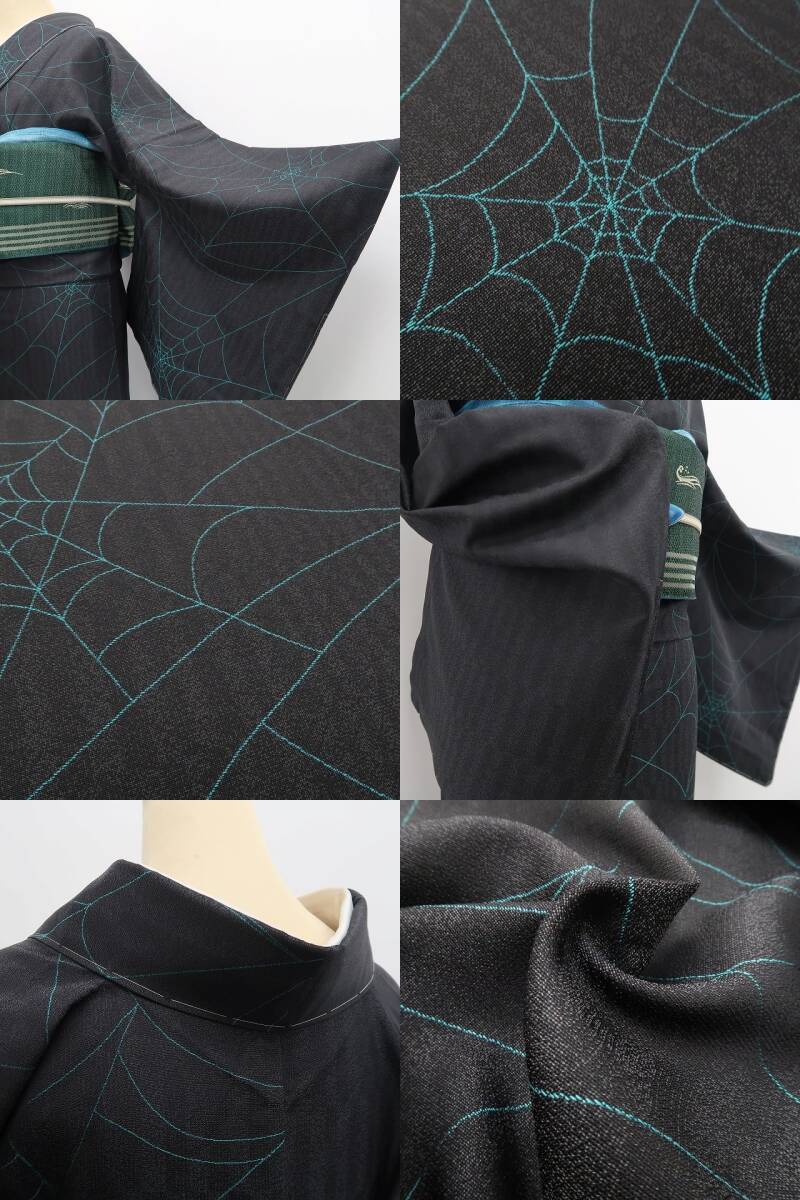 深みある黒の色地にまるでアートのように描き込まれた洗練モダンな蜘蛛の巣デザイン、片身替わりの構図に広がるえも言われぬお洒落感は必見の価値あり!それは正に“創作着物の魅力”そのもの…お召独特のしっとりとした風合いが着物の味わいを一段と馴染みやすい趣に変えています。