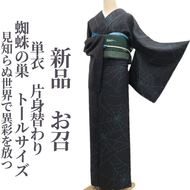 新品 単衣 片身替わり 蜘蛛の巣 着物“二人の自分!見知らぬ世界で異彩を放つ”正絹 仕付け糸付 トールサイズ お召 6619