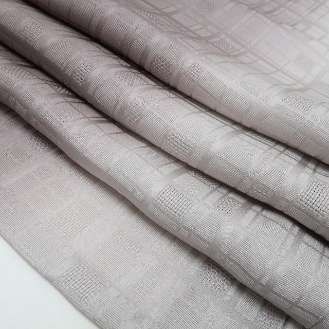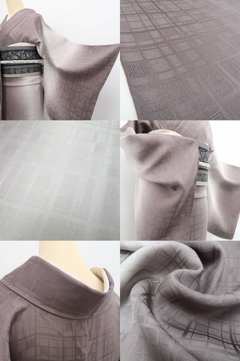 暈しの技が活きる落ち着いた桔梗鼠色の彩色、縦状の柔らかな濃淡に引かれた格子状のデザインライン、それは単衣の透明感に醸し出されるこの上ない夏の色艶、ダイレクトにセンスの良さを感じさせてくれる一枚…正絹のしっとりとした風合いが着物の味わいを一段と馴染みやすい趣に変えています。