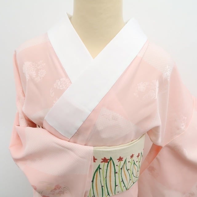 こちらのお着物は、ライトトーンの彩色で意匠の美しさにフォーカスしたデザイン性の高い組み柄を込めております。四角形の連続が創り出す市松文様の魔法、配色を変えることで無限に変化する文様に生まれ変わります。