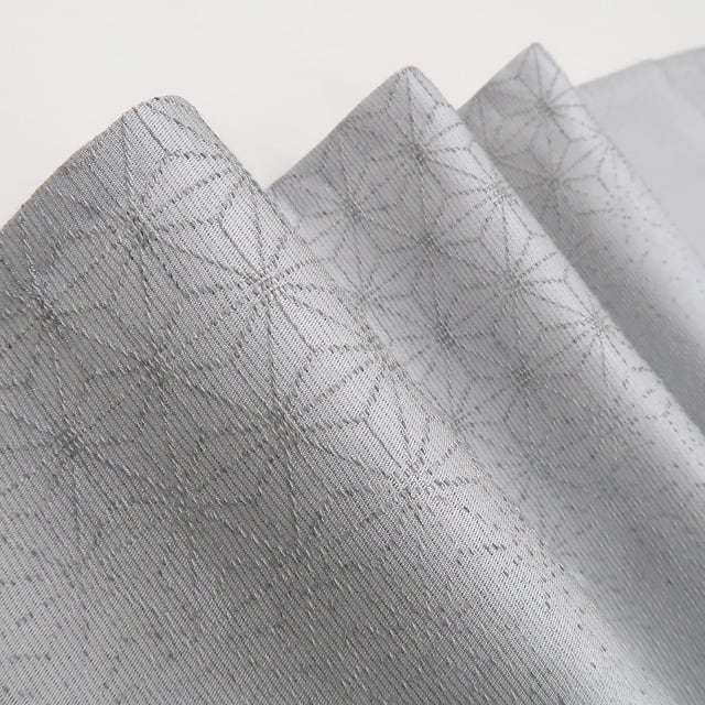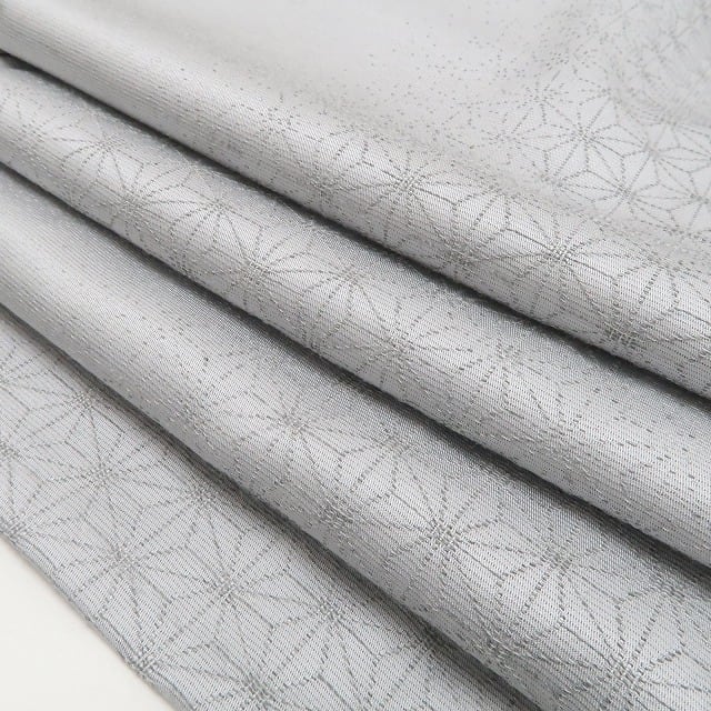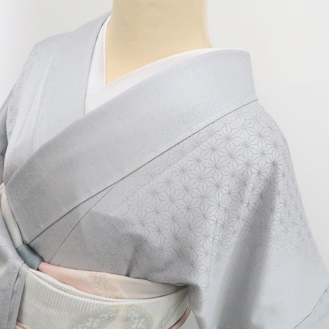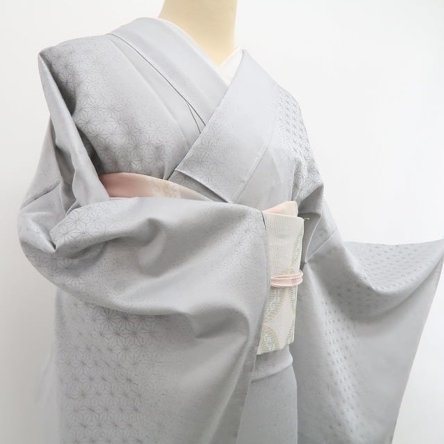 グレーの色地全面に描き込まれたデザイン麻の葉の繋ぎ模様、彩りの濃淡に艶めいて浮かび上がるその表情は“創作着物の新しい風”、洗練されたデザインセンスでエレガントに個性の美を演出するひと品、大人の女性にだけ着こなすことができる極上の味わいをお楽しみいただけます。
