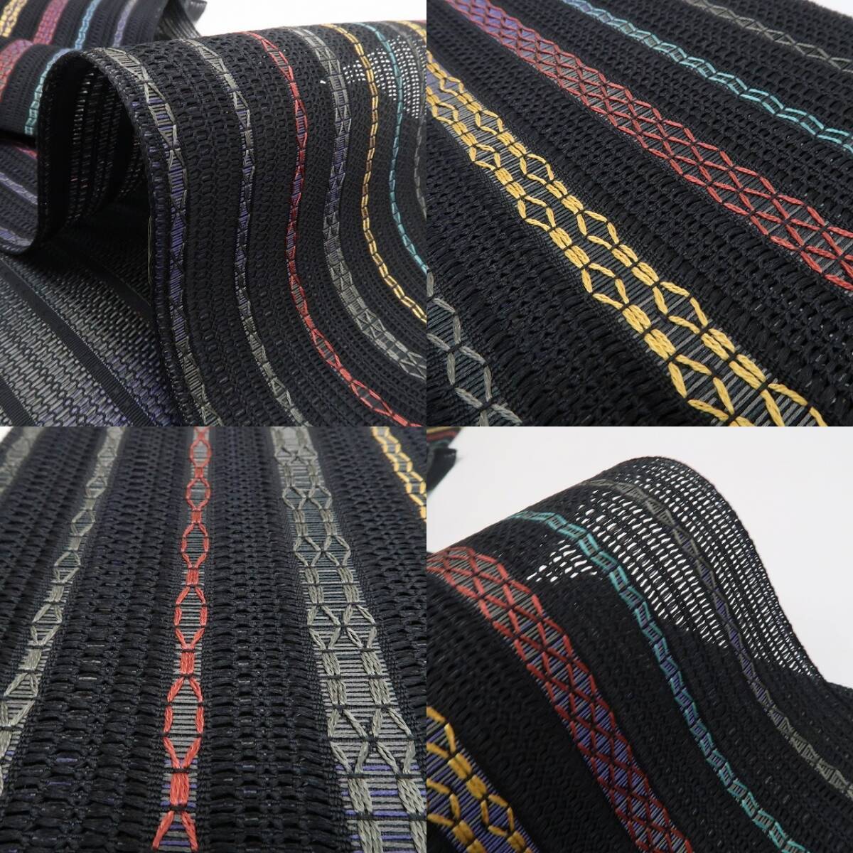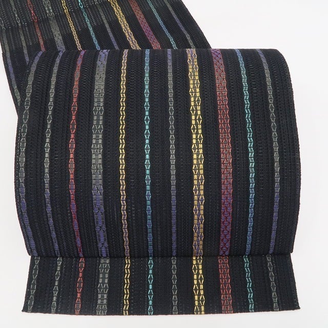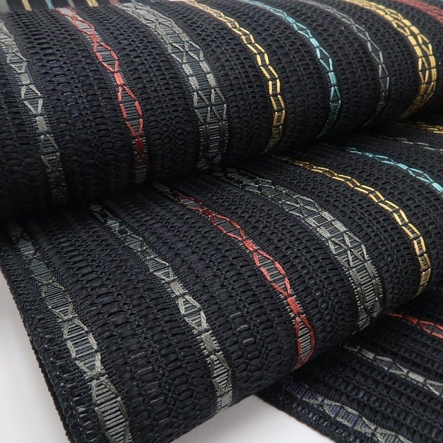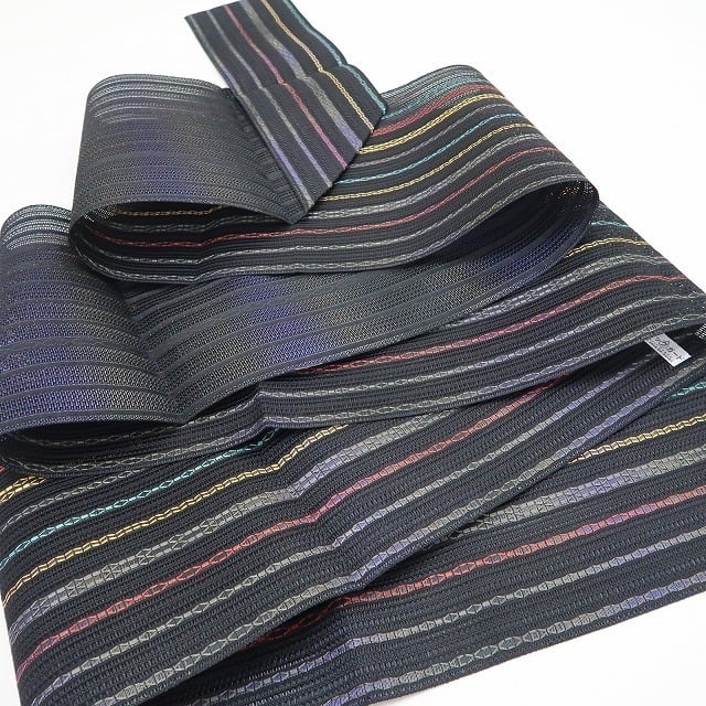 こちらの帯は黒地に多彩な縦縞を織り込んだ夏帯。太さや織り柄のことなる縞が軽やかなリズムを生み出し、残暑の着姿に洒落感を添えます。透け感のある羅ですが、黒をベースにしているため落ち着きがあり、涼やかさとシックさのバランスが絶妙です。