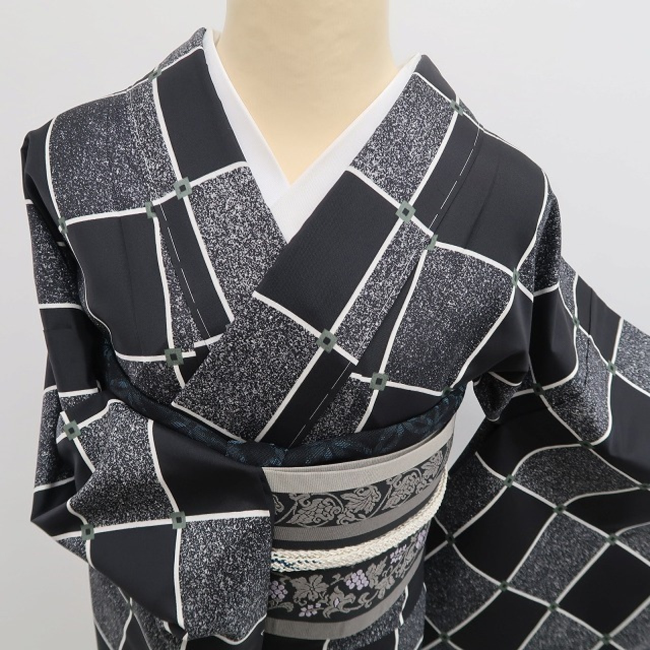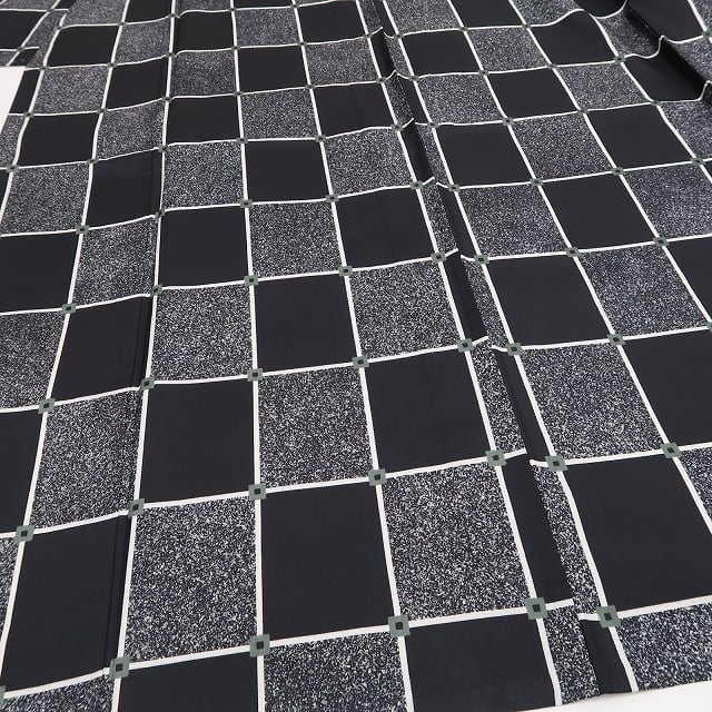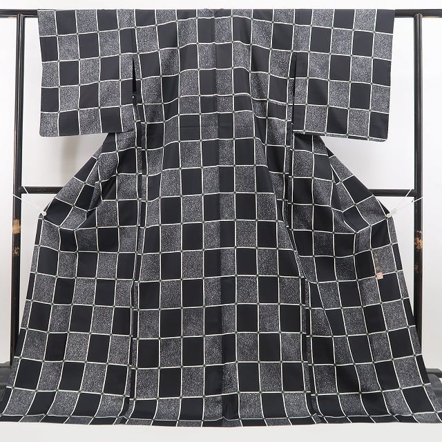 モノトーンに市松模様を染め上げた一枚は、帯合わせ次第でシックにも華やかにも。伝統的な柄行ながらも、差し色の帯や小物を添えることでモダンな装いをお楽しみいただけます。