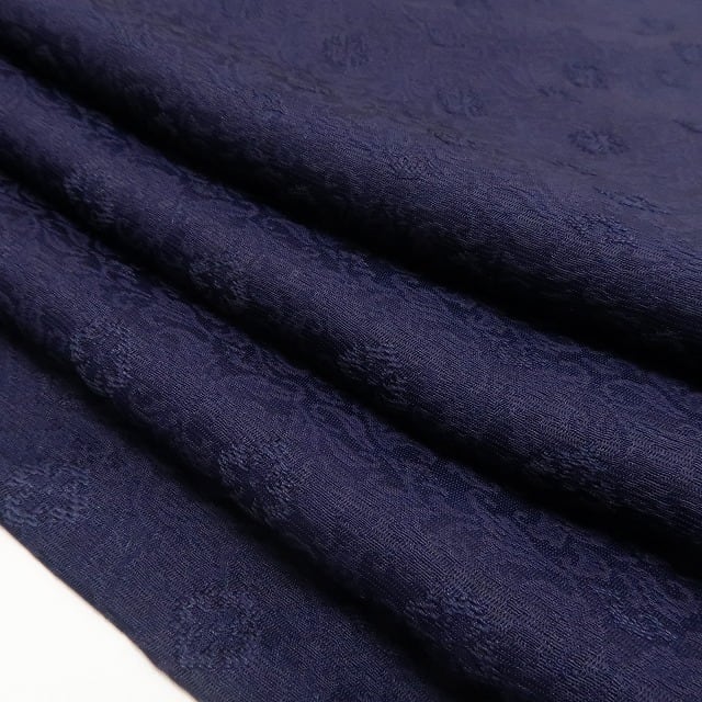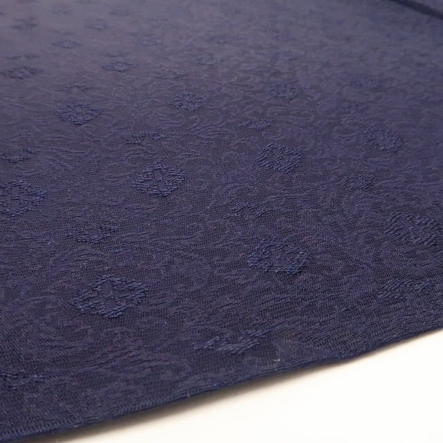 こちらのお着物は、鉄紺色の藍染に唐花の地紋を織り出した一枚。深みのある藍染が洗練された着姿を演出し、唐花の地紋がさりげない華やぎを添えてくれます。凛とした印象を与えながら、落ち着いた大人の洒落感を漂わせます。