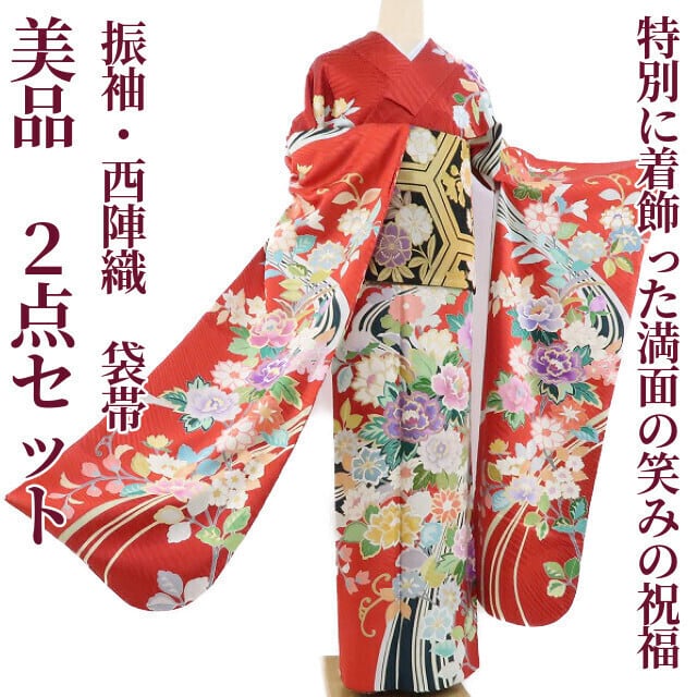 美品 2点セット 金駒刺繍 成人式 着物“特別に着飾った満面の笑みの祝福”振袖・西陣織 袋帯 1371